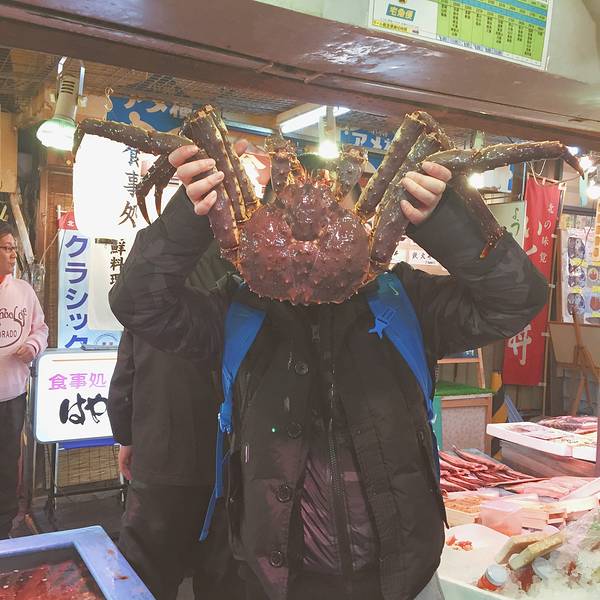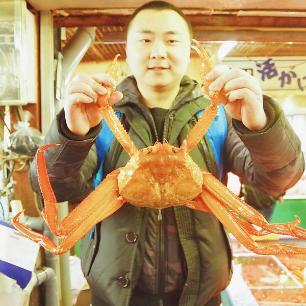 溜达到11点多,差不多该回去小樽了。 三角市场我们来啦! 随意选了一家,价格好像都差不多。 老板热情得不行非给我们一人提一只螃蟹拍照。