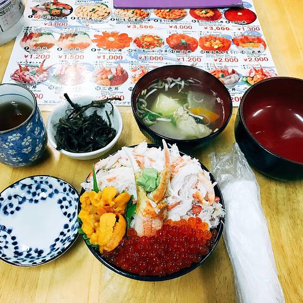 机场到小樽站1h15min。 我是大概1点到的小樽站,出站后往左边看即可看到三角市场。三角市场是主要卖海鲜和海鲜干货的市场,里面也有饮食店 出了三角市场,就找了家店吃饭,定食套餐
