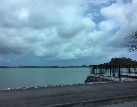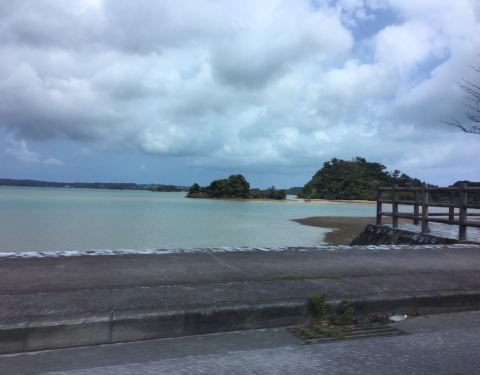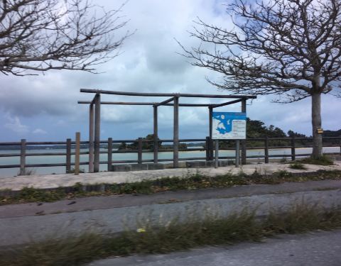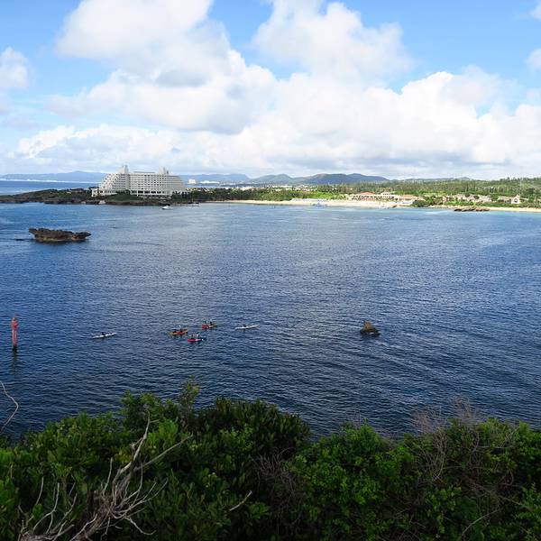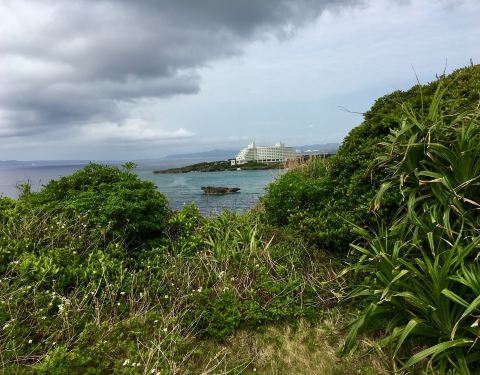 沿着观景步道转一圈,不过10分钟的时间。前半段可以观赏万座毛的美景,后半段则可远远望见点缀着几座礁石的平静海湾,以及在海湾环抱之中的ANA洲际酒店和酒店沙滩,——那里不仅是《恋战冲绳》的取景地,也是拍摄时王菲、张国荣入住的酒店。