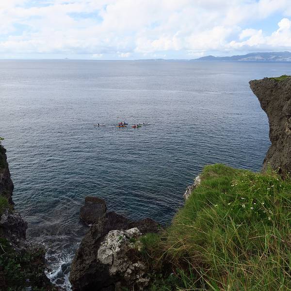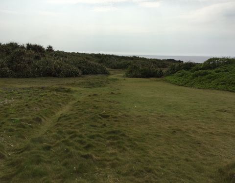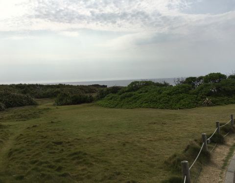 万座毛在日语中是“万人を座するに足る毛”,其中“毛”在冲绳方言中指的是“原野”,所以这里指的是“能供万人坐下的原野”。其实不过是一处象鼻型的断崖,崖上是一片辽阔的青草地,若说能坐万人,也确实夸张了。不过断崖下的海水在阳光下呈现出层次深浅不一的湛蓝,听着海浪拍打崖壁的声响,远眺海天一色的美景,确是不旺前来的一处美景。