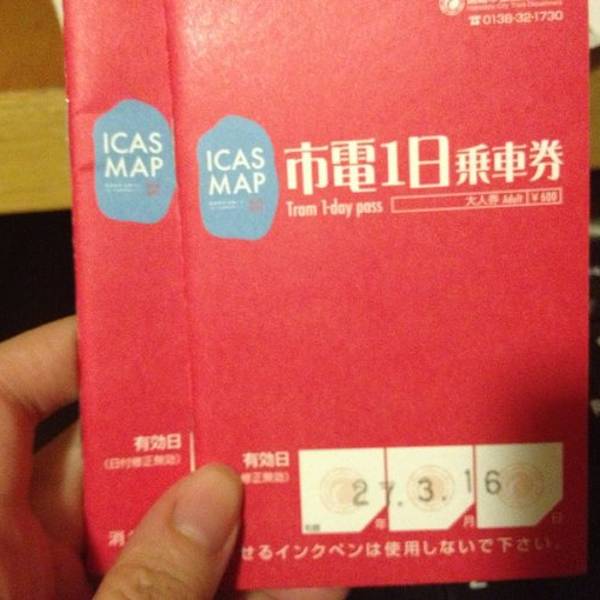 大沼有个邮便局,寄了明信片,敲了章。回函馆咯。到了JR函馆站,出站后,左手边就是观光案所,去买 twinkle joy 500当550用,实际用下来,灰常好用哦。 官网 http://www.twinkle-joy.com/area/hakodate/ 我去时候的coupon 是到2015.3.31 之后的大家看看官网还会不会继续有优惠 在去JR函馆站的 book shop买了 市电一日券 600/张,当然BUS也有一日券,为了省钱,还是市电。事实是市电车上也可以问司机买市电一日券,灰常方便。买的时候告诉他们你要用的时间,他们会敲好给你哦 JR函馆站卖市电的时间,如果超过时间,车站里面有个book shop也可以买,例如我是在晚上22点买的