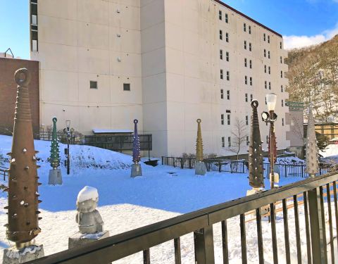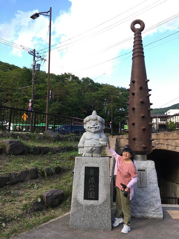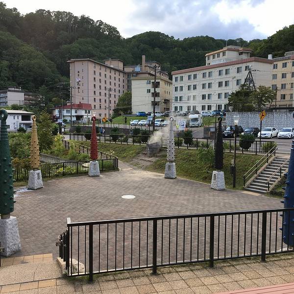 其实公园就在主街一侧,就在我们住的第一泷本馆酒店楼下,非常迷你,甚至小到概念意义上连“公园”都称不上,我站在宾馆楼下找半天也没看到附近有任何可以称得上公园的东东。还是道道理解力,指着不到200平方米的下沉一角,那就是公园!所谓公园的广场中的8根颜色不一样的狼牙棒。公园的得名,是守护登别温泉的“汤鬼神”与其9个泉种,据说是9根棒,不过我们只数到8根。