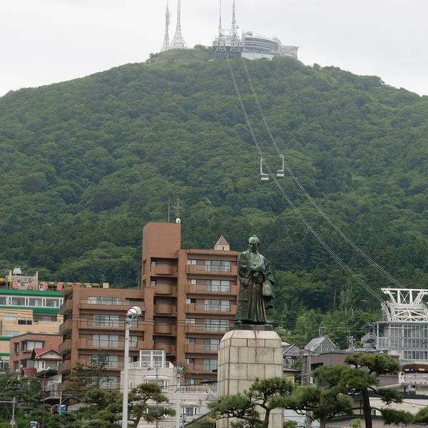 搭乘市内电车,在十字街下车,步行10分钟抵达缆车站,再乘缆车3分钟登上山顶。