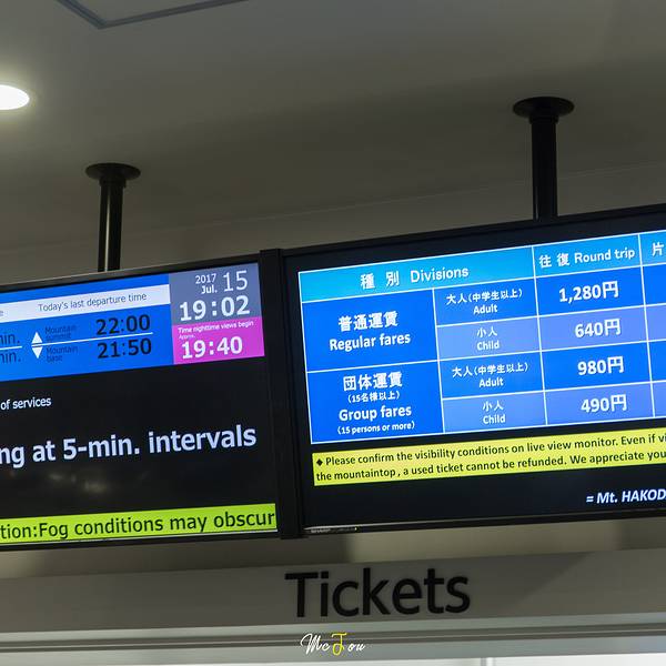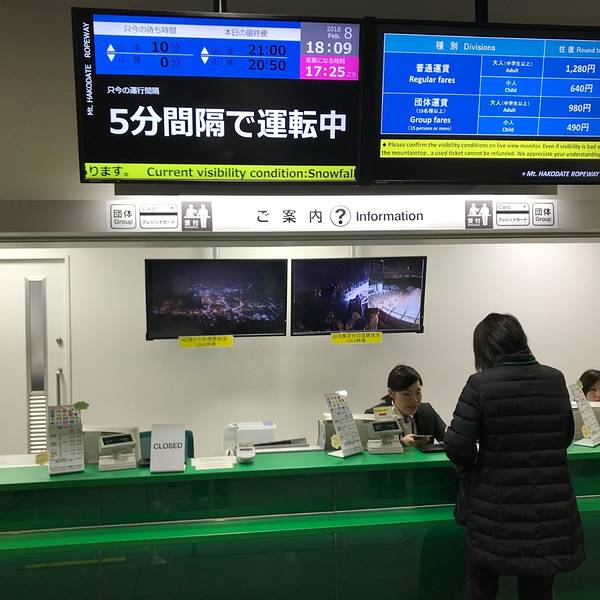交通:搭乘市内电车,在十字路口站下车,按照指示牌步行约10分钟左右到达山脚缆车,坐缆车可以直达山顶缆车票价:成人1280日元 儿童600日元 售票处有显示屏可以看到当时山顶的情况,如果有大雾也可以选择改天再登山,还是建议提前看好天气预报再出发,不然白跑一趟啦!索道票一定要留好,下山时还是需要扫码的
