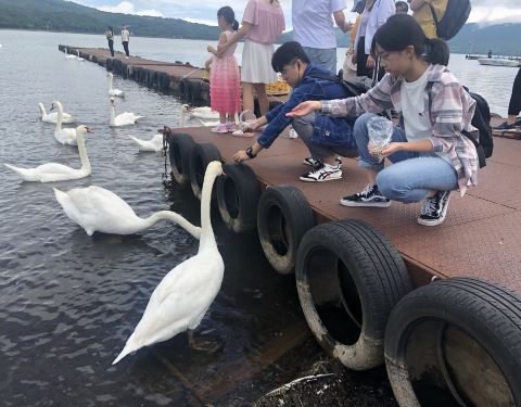 天鹅其实一点不温柔,把饲料放在手上喂,会被天鹅咬的很疼。小朋友很喜欢此类活动离开富士山开不了多久就到这里,据说是夏天避暑的好地方,反正温度适宜。湖面开阔,可以喂鱼和喂天鹅。天鹅其实一点不温柔,把饲料放在手上喂,会被天鹅咬的很疼。小朋友很喜欢此类活动。