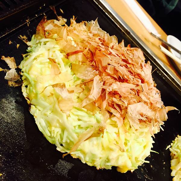 店员会在你面前现场制作,两面都煎好的大阪烧会刷上特制的酱汁、美乃滋、柴鱼片和青葱海苔粉。用勺直接挖着吃,外面煎的焦香,里面是嫩嫩软软的内料。作为在日本吃不上蔬菜就难受星人来说,大阪烧真的是极好的选择了。