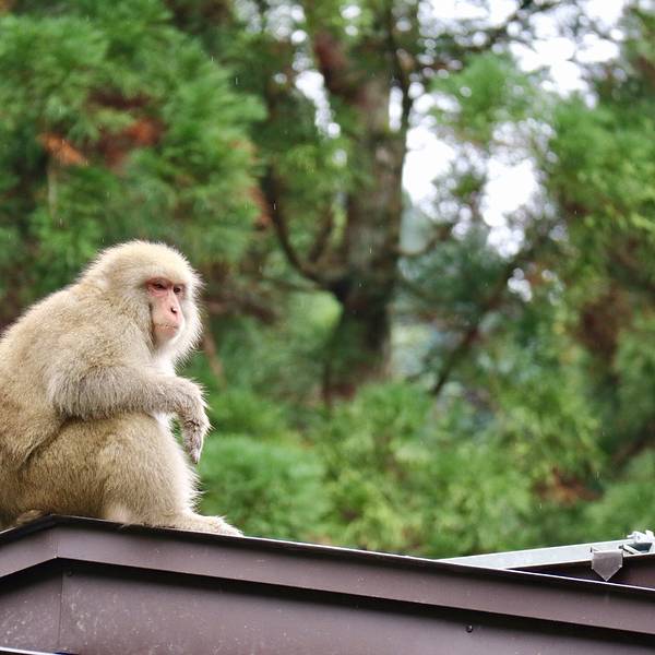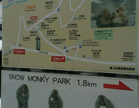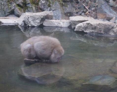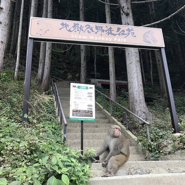 进去之后可以看到许多猴子在肆无忌惮的泡温泉。还没进公园大门,就冒出了一只猴子。公园门票是800日元2点钟坐上班车下山,到了野猿谷公园站已经3点,沿着长长的森林步道往里走,大约半小时,就看到了温泉山庄。