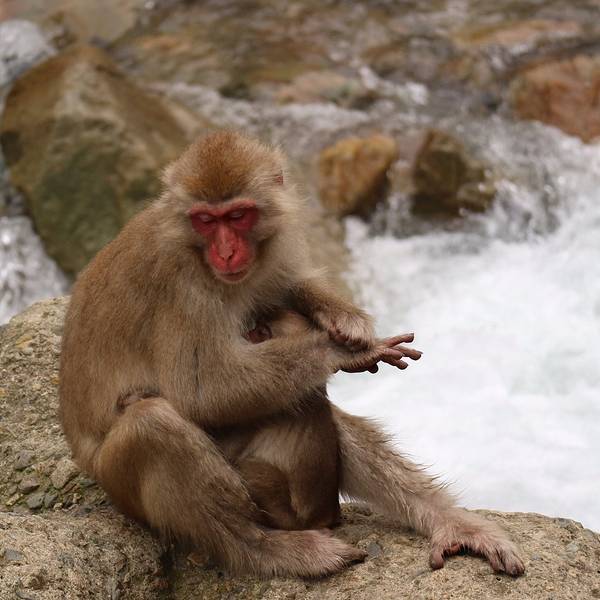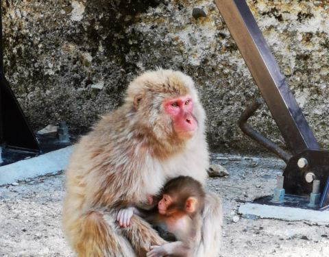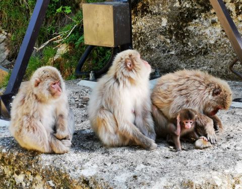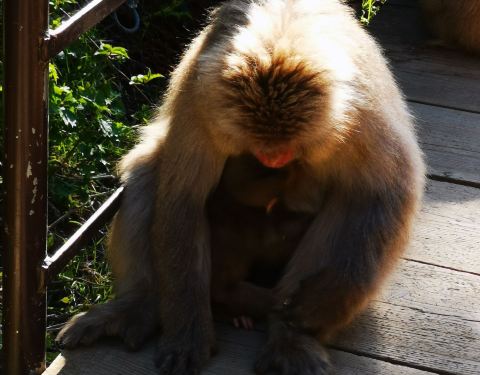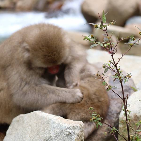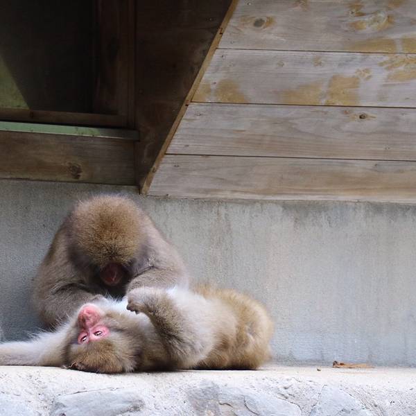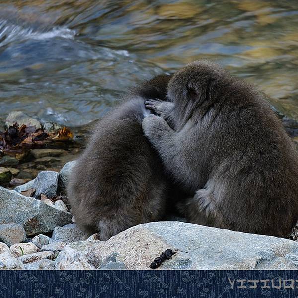 后乐馆房顶的猴子大大咧咧坐在温泉喷发口的壮硕大猴子,我觉得他应该是猴王,因为当老顾想靠近他时,王怒了。王仿若有灵性,自顾自的玩了一会觉得应该带我们前去见见他的后宫和孩儿们,于是他不紧不慢的带着我们向售票处走去。看见了吧,这是在告诉我们参观后宫得付多少过路费。进园后,王给老顾来了一个下马威,似乎在警告他别来挑衅一个王的尊严,王是不合照滴!天气还是不够冷,此时木有猴子在泡温泉。猴群中通常是母亲带着孩子,或是几只雌猴在给雄猴抓虱子。后来看了篇文章上写道其实猴子身上并没有那么多的虱子,他们会那样做其实是在找寻附在皮肤表面毛发中的盐粒晶体,以补充他们无法从食物中摄入的盐分。十月是猴子的发情季节,看到屁股和脸的颜色发红就代表这只猴子正处于发情期,要注意安全啊,亲们!虽然王不能轻易让人接近,可其他的猴子并没有这个禁忌,完全无视身为人类的我们在他们身边走过,唯独当相机快门声音响起的时候他们会背过身去,不愿意被打扰。后来我们才知道,来看猴子不必赶早。每天中午时分工作人员会定时在温泉池附近投食,聪明的猴子早就掌握了这个规律,每天会按时到来。这样说起来我们似乎被门口的外国女子骗了!她应该只希望我们买手信就好。