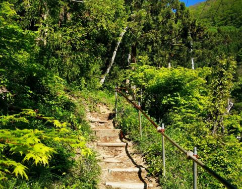 到了停车场,老板反复告诉我们怎么走,因为我们游完后要直接去汤田中火车站,从山里下来要沿横汤川南岸走,有登山步道可以到达公车站,然后搭车去汤田中,而他则原路返回,把我们寄存在酒店的行李送去车站旁的咖啡店暂放。