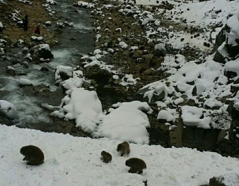 横汤川从东方的山里一路流来,到汤田中附近与来自东南方向的角间川相遇,汇合成夜间濑川。位于汤田中东边横汤川北岸的涉温泉乡,去地狱谷最直接的路就是沿河而...一大早,我们坐着酒店的车上山去地狱谷的野猿公苑。