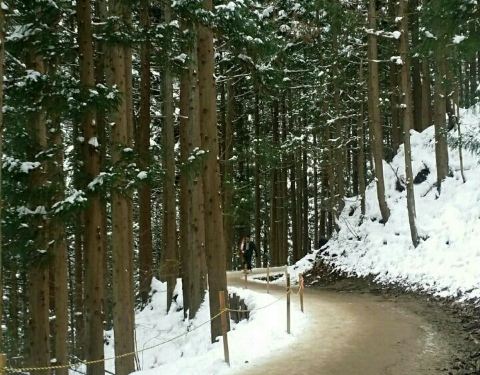 长野县的地狱谷野猿公苑也叫Snow monkey park,有着全球唯一一处野生猴子专用的温泉,所以可想而知这里对我的吸引力有多大,也可以说这次长野之行的最大目的就是看泡温泉的猴子。从长野电铁汤田中站或者渋温泉街都有巴士开往上林温泉,也就是地狱谷野猿公苑的入口处,再从入口处走到猴子泡温泉的地方大约有30多分钟的山路需要步行,若是冬季积雪的日子必须要非常小心路滑,建议穿着防滑靴和携带登山仗。而现在这个时候山路平稳,十分安全。野猿公苑的猴子温泉外头有一家名为“后乐馆”的温泉旅馆,在这里你也许有幸能和猴子在同一个泡池中享受泡温泉的乐趣。当天和我们一起到达野猿公苑山下入口处的还有两个日本中年妇女,才刚要踏入山林,一边的小商品店里走出一个外国女孩子,她说现在地狱谷里没有猴子,并且不知道猴子什么时候会来,毕竟来这里泡温泉的都是野生日本猴。