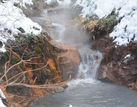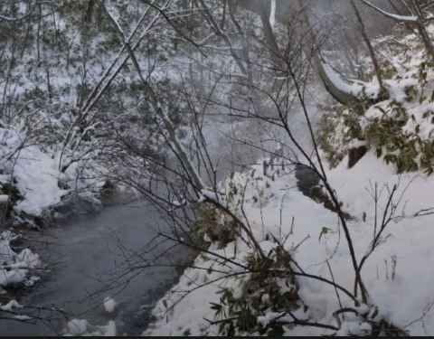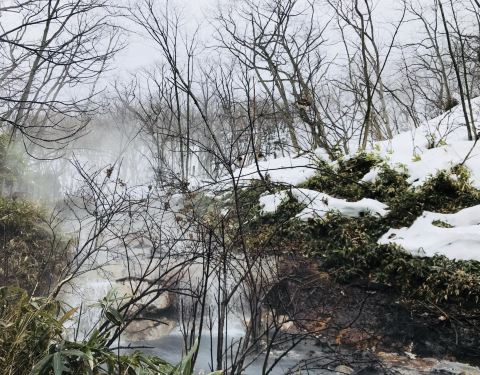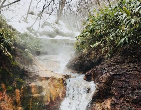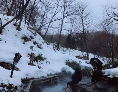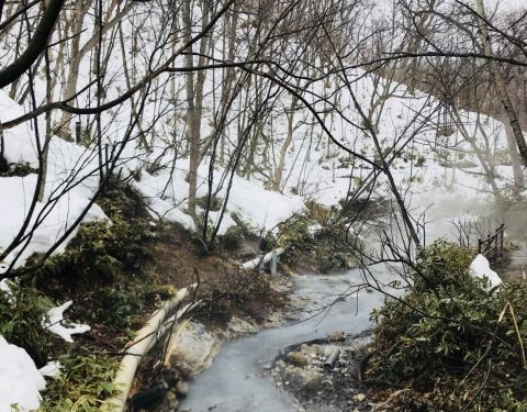 从温泉街过去,沿着上山的路走进登别原始林,大冬天积雪很厚,大路经过铲雪比较好走,但是小道还是比较滑,需要冰爪,林子深处有天然足汤,好好享受一番。