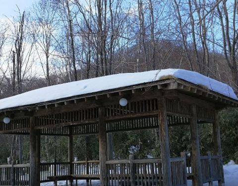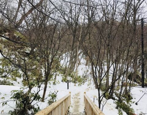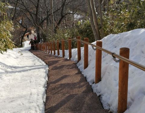登别原始森林___位于地狱谷的山上,沿着山路走上去,大雪覆盖了一切,只能走修好的栈道,周围的空气非常清新,这里有186公顷的原始森林,多达60多个树种。如果是春季来,会相当的清新凉爽。