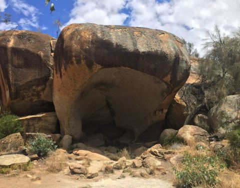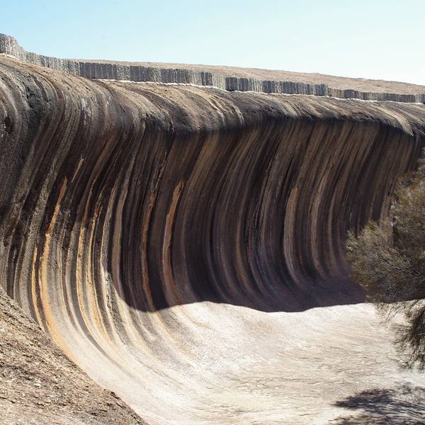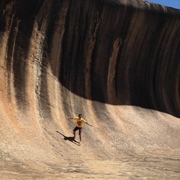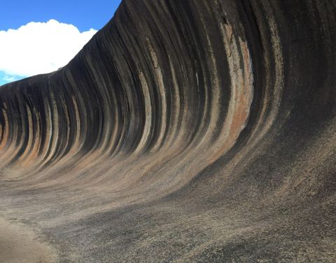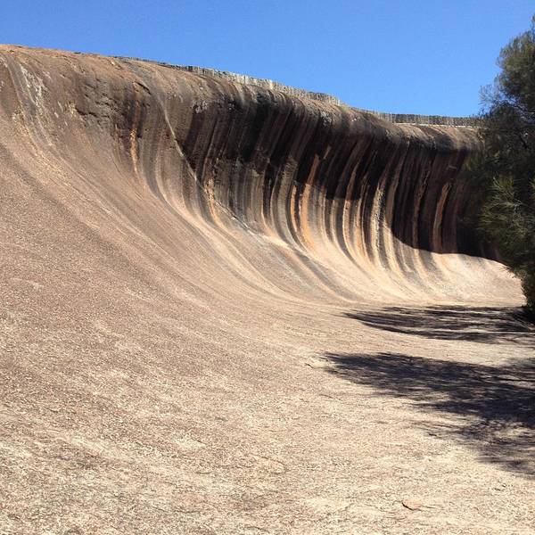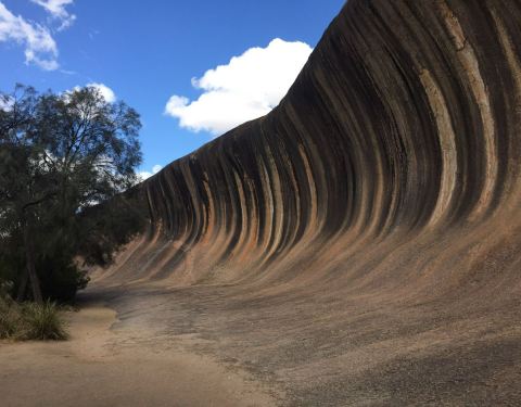 如果你一时没能去澳洲中部瞻仰那块瑰丽奇妙的“澳洲之心”,那么身处澳洲西部的你,不妨去观赏大自然鬼斧神工在澳洲留下的又一奇迹波浪岩。波浪岩是一块波浪形状的单片岩,它高15米、长110米、犹如滔天巨浪高高掀起并瞬间凝固半空中,它身上有一条条红褐色、黑色和灰色的条纹,在阳光映射下特别漂亮,很值得你从珀斯跋涉近350公里的漫长道路来这里观看。接下来,你要不要在这个固体波浪上摆一个冲浪的姿势呢? 据说屹立在广阔、干燥的沙漠中的波浪岩,在27亿年前是一块大部分埋于地下的大岩石,漫长的岁月中,含有各种化学成分的水分渗入地下将岩石底面慢慢侵蚀松化。后来,岩石周围的土壤被冲刷掉,被侵蚀的岩石底部露出地面。强劲的沙漠风挟沙粒和尘土的吹蚀把岩石较下层的外表挖去,留下成蜷曲状的顶部。雨水将矿物质和化学物沿岩面冲刷下来,留下一条条五彩斑斓的条纹。 波浪岩附近另有一座美丽的岩石,名叫河马之口(Hippe's yown)。它是一座空心岩,外形像河马张开的嘴巴。向北几千米处还有一组奇形的岩石,名叫驼峰岩。周围的岩石区中还有一个曾经有土著居住过的墓尔卡洞窟。洞中发掘出来的土著人手工版画是西澳值得骄傲的艺术品。墓尔卡这个名字来自于洞中的遗迹所提及的一个古代土著的大人物的名字。 波浪岩位于珀斯以东340公里处的海顿(Hyden)附近,从西澳州的首都柏斯出发大约5个小时的车程, 澳州沙漠中的波浪岩如今在澳洲已成为标志,早在25亿年前就已经形成。波浪岩名副其实就像一片席卷而来的波涛巨浪,波浪岩令无数的旅客赞叹大自然的鬼斧神工。每年都会有大量慕名而来的游客前来拜访波浪岩。