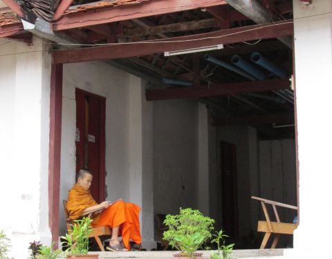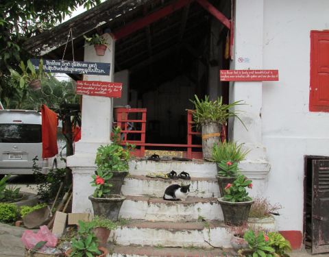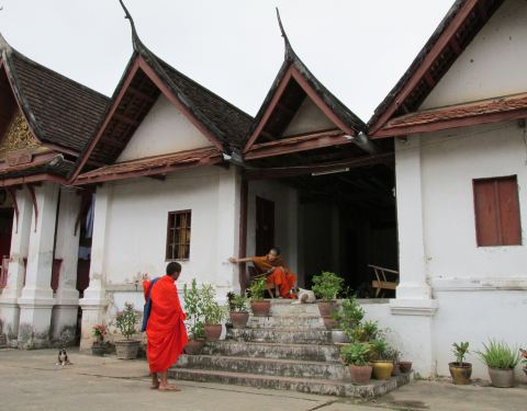 迈佛寺是我在去王宫博物馆的路上路过看到的,顺着河边公路往王宫博物馆走,左手边出现了一个尖顶,有庙子,于是本着路过不错过喵一眼的原则,停车抓紧看。果然有喵,还有调皮的小和尚,接近中午时间没读书在扫地了。庙子其实还可以,就是看不懂。