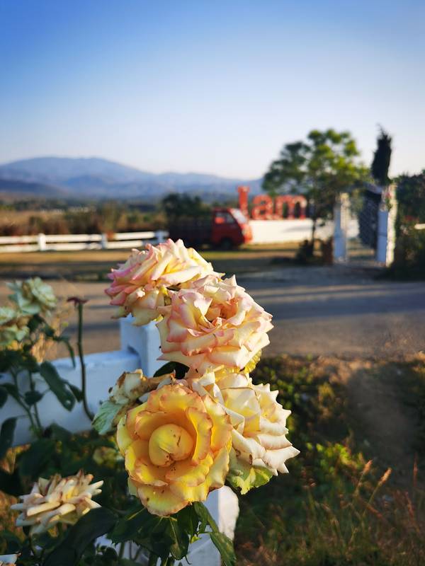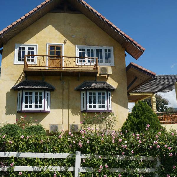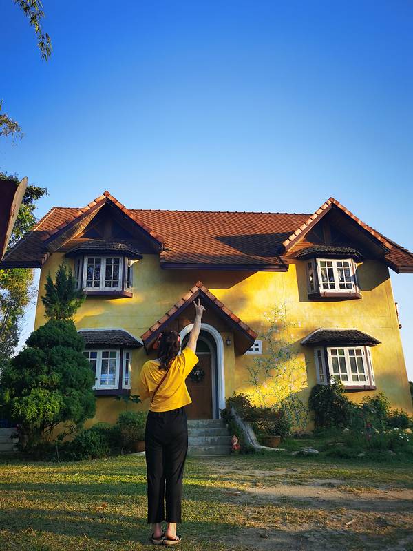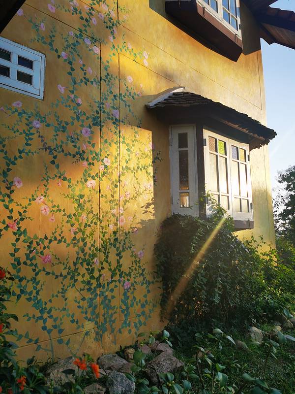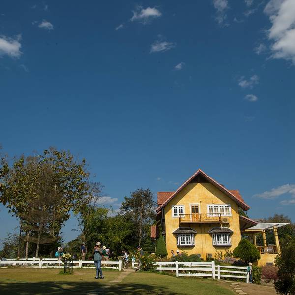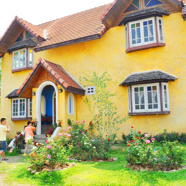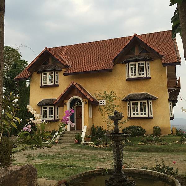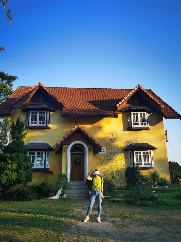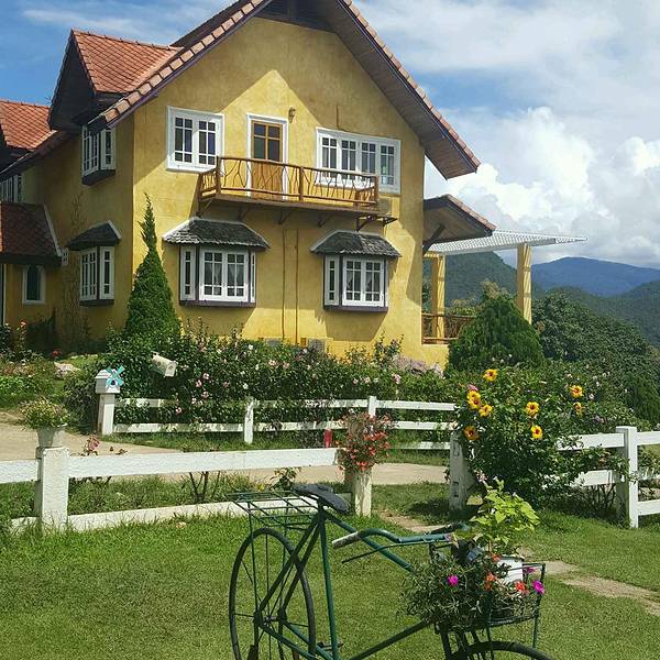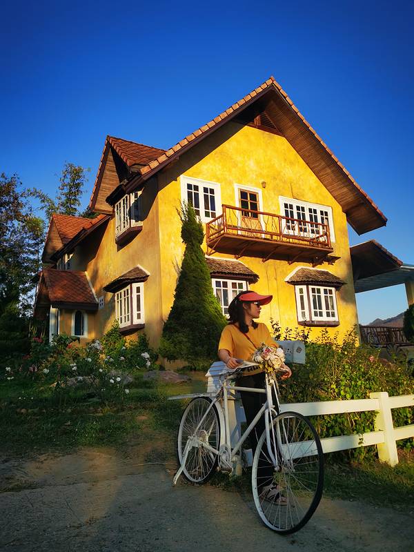 这些景点都是不门票的,个人建议,还是在县城内租用摩托车出行(130铢/辆/24小时),按以上线路,开着导航软件游览。相对自由,费用又划算。从县城出来,国道上摩托车行驶,很快就能到达。先入眼的是大大的亮眼的黄色建筑,然后才是上图的标志。蓝天白云下,绿草花丛中,这座黄色欧陆风情小屋、外加门前一辆复古自行车,俨然就是偶像剧里的场景。吸引众多游人在此拍照留念。屋旁一条小道,通往一片大草地。这样的田园风光,让看者都觉得心情舒畅。这间小屋有三层,但并不开放。虽然很抢眼,但所谓的咖啡馆主体其实并不在这里。而是小路另外一侧的小红屋内。咖啡馆门前种了许多花卉,还有很多代表着爱情的玫瑰花。这里的咖啡和甜点并不贵,人均几十元人民币。