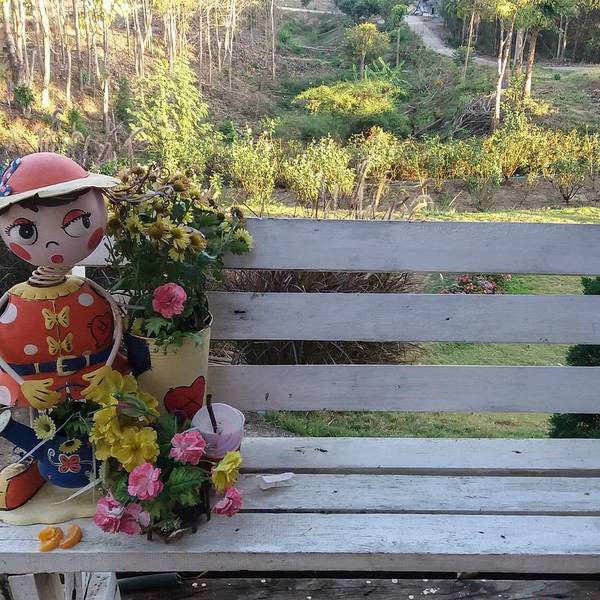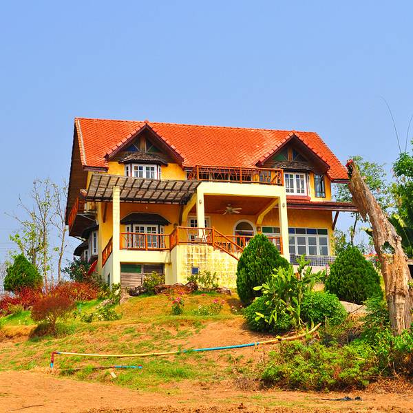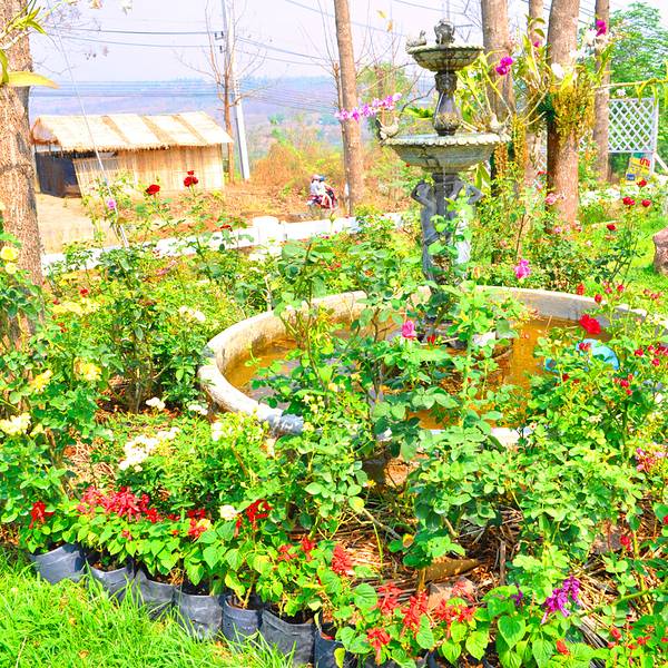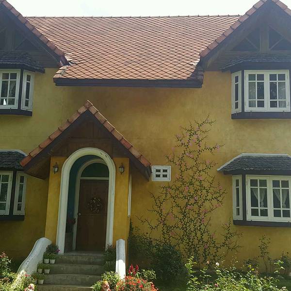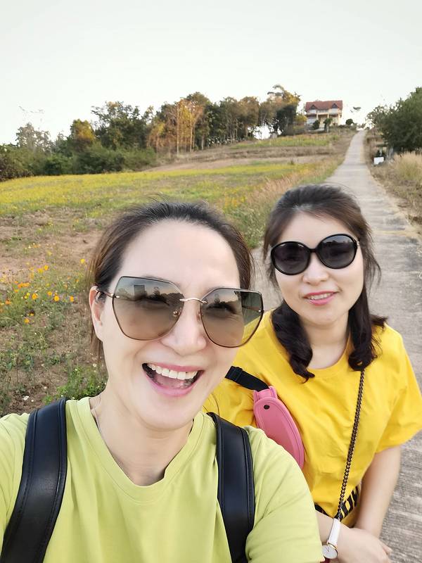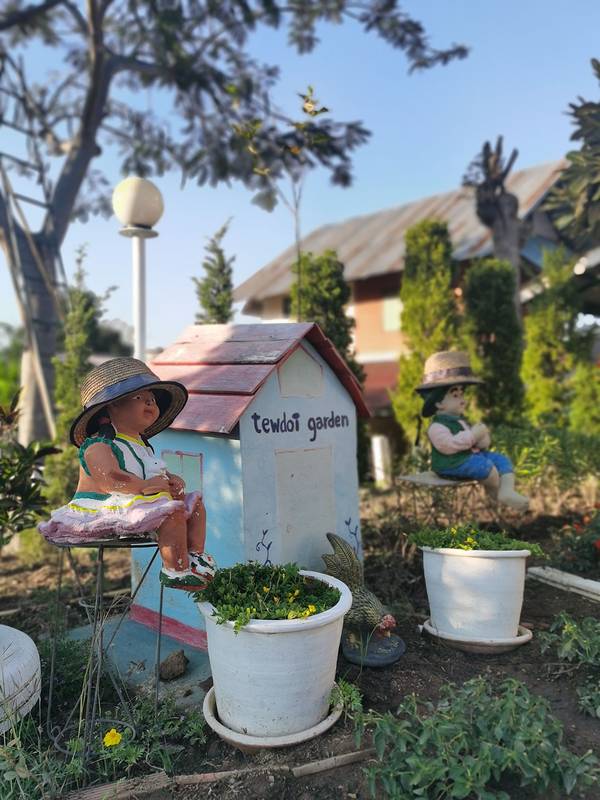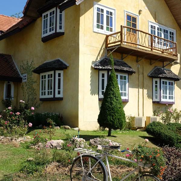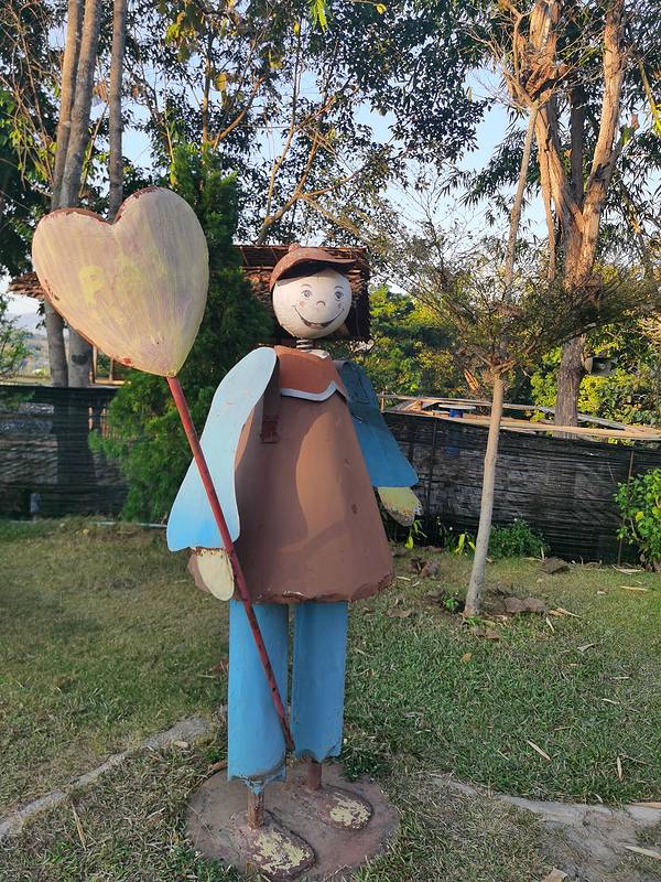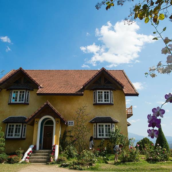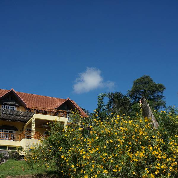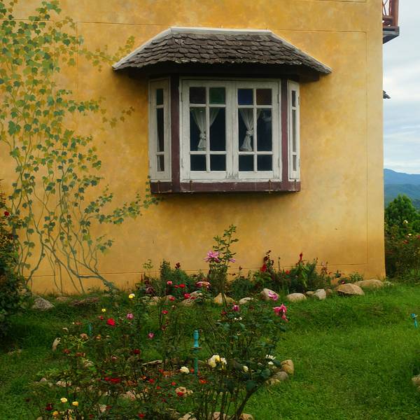 这些景点都是不门票的,个人建议,还是在县城内租用摩托车出行(130铢/辆/24小时),按以上线路,开着导航软件游览。相对自由,费用又划算。从县城出来,国道上摩托车行驶,很快就能到达。先入眼的是大大的亮眼的黄色建筑,然后才是上图的标志。蓝天白云下,绿草花丛中,这座黄色欧陆风情小屋、外加门前一辆复古自行车,俨然就是偶像剧里的场景。吸引众多游人在此拍照留念。屋旁一条小道,通往一片大草地。这样的田园风光,让看者都觉得心情舒畅。这间小屋有三层,但并不开放。虽然很抢眼,但所谓的咖啡馆主体其实并不在这里。而是小路另外一侧的小红屋内。咖啡馆门前种了许多花卉,还有很多代表着爱情的玫瑰花。这里的咖啡和甜点并不贵,人均几十元人民币。