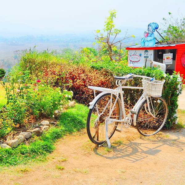 恋爱咖啡馆因为《love in Pai》而变得非常火,略带欧洲田园风的小独立别墅,搭配着草坪上白色的复古自行车还有白色的矮篱笆墙,显得十分文艺和小资。恋爱咖啡馆和大树秋千离得很近,要稍微留意一下,都是在朝拜县...恋爱咖啡馆因为《love in Pai》而变得非常火,略带欧洲田园风的小独立别墅,搭配着草坪上白色的复古自行车还有白色的矮篱笆墙,显得十分文艺和小资。恋爱咖啡馆和大树秋千离得很近,要稍微留意一下,都是在朝拜县县城开的公路的左手边。在经典的黄色小屋的右手边就有一个名副其实的小咖啡店,需要上几级小台阶走到二楼,从露台往外看,是很美的田园风光,也是午后可以稍作休息,避避暑的好去处。【关于线路】其实拜县小清新一日游的游览路线非常简单,就是沿着1095公路一路走,一路看就好了,一路都是很好的拍照点,可能有的并不是非常出名,和考山路的逛吃逛吃相比,拜县一日游的主题就是拍拍拍。由于我们当初住宿选择的是离拜县市区7公里的孔径,所以正好上午十点多出来,一路扫到市区,正好傍晚,可以吃晚饭,正好能赶上拜县夜市~可以作为一下参考哟~【关于美食】推荐一下小咖啡馆的咖啡还有蛋糕,可能也是正值中午,有些饿了,觉得味道特别好,是爱甜食的小伙伴的最爱。但是蓝莓口味的cheese case略甜,不爱吃甜的小伙伴慎选。【关于小布布】一般是在市区会有很多租摩托车的地方,我们当初选择的是aya,大概是一辆车24h 200B左右,可以作为参考价格~