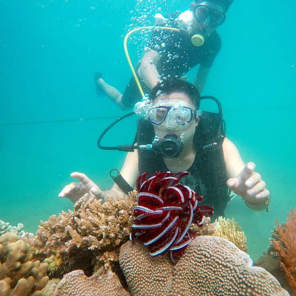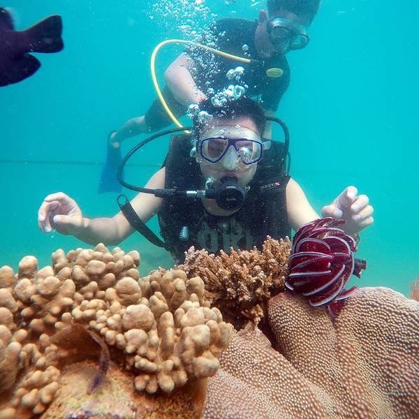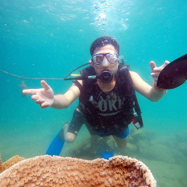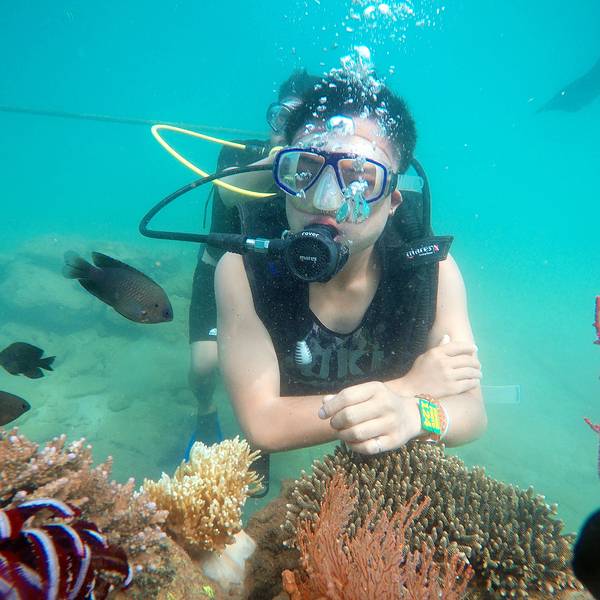 原本以为只是浮潜,后来才知道在竹岛不需要潜水证也可以深潜,不过这里的深潜只能在指定的一小片区域里,而且每个人都会有一个潜水教练一直陪伴左右。