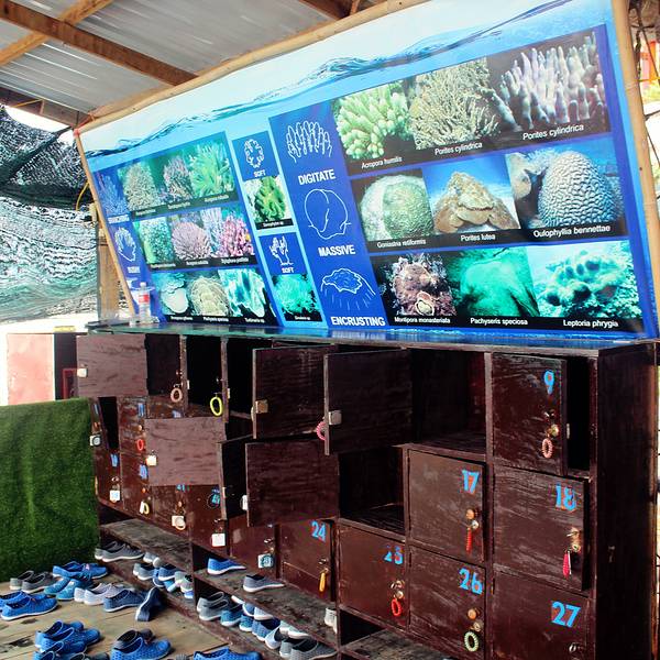 登岛后左行便是潜水区,费用是300块人民币,换好泳衣后便踩着浮桥来到离岛并不远的浮岛之上,换好装备便直接下水。