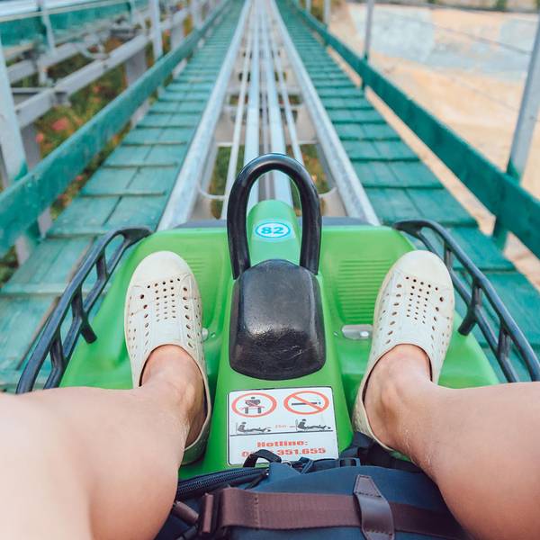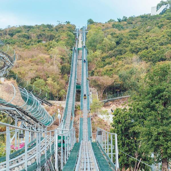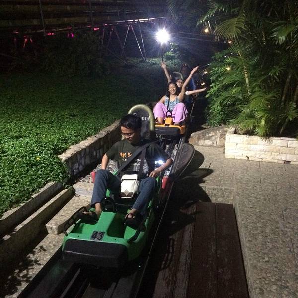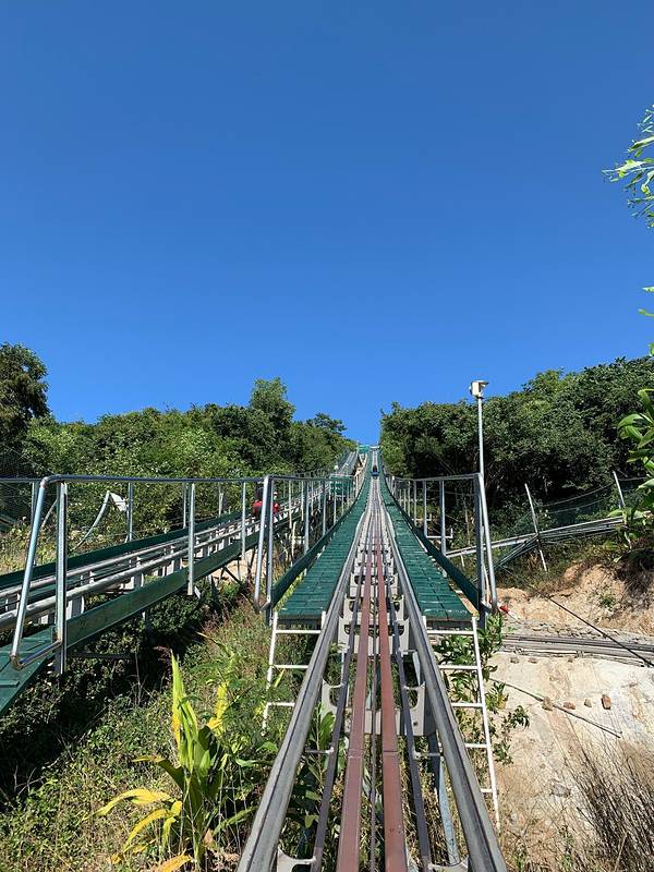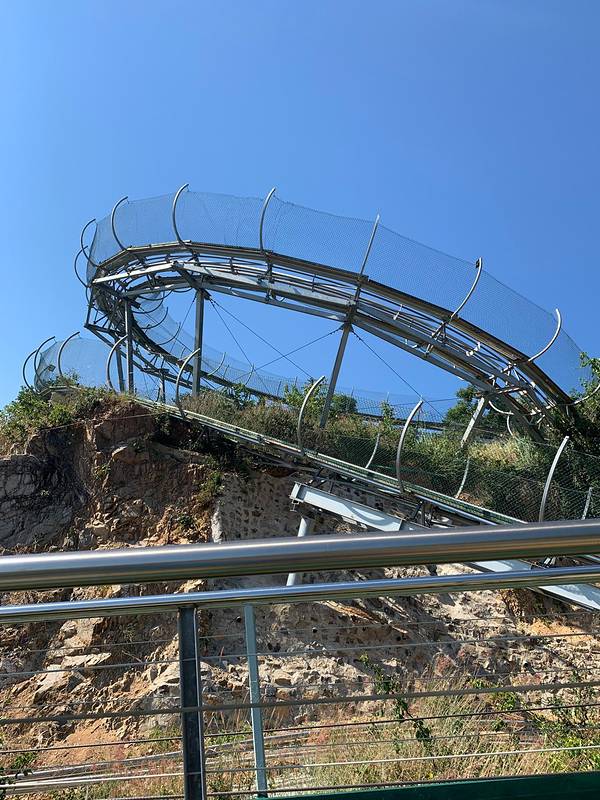 全程有1.8公里,真的非常刺激,从你坐上开始就一直爬升差不多有100米吧,然后从最高点开始往下飞驰,其实整个环节是可以控制车速的,刹车就在左右边,觉得车速快了随时刹车就OK。