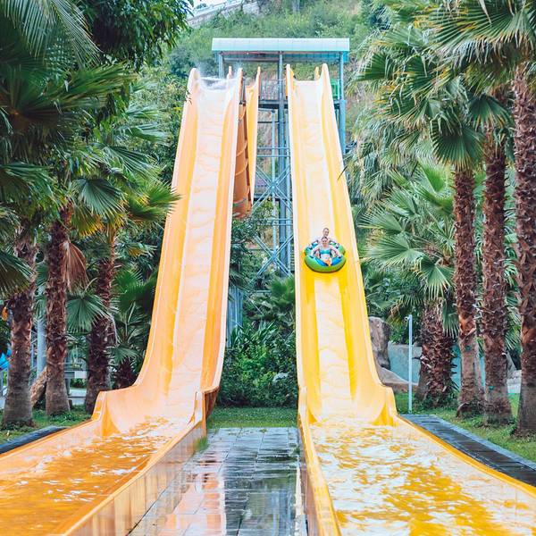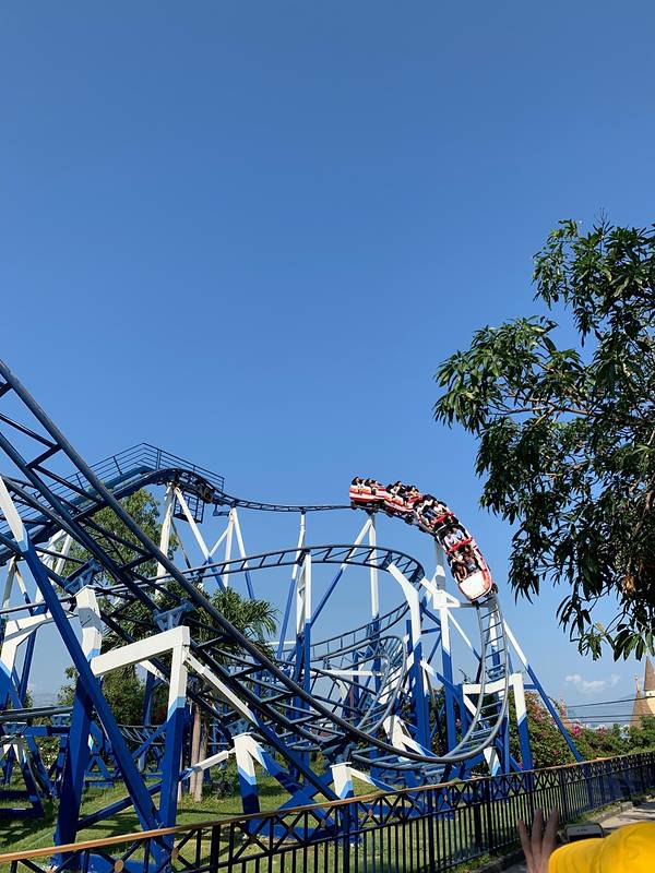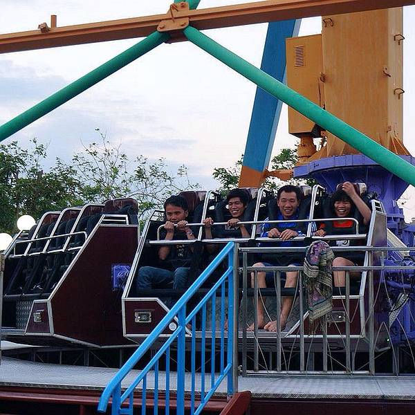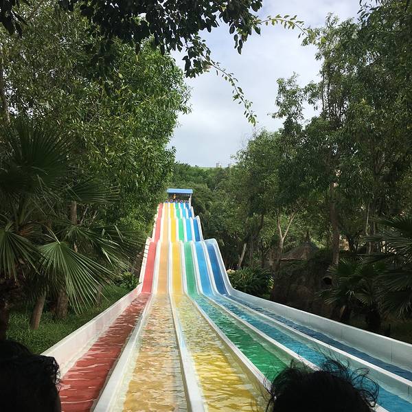 乐园里面有各种各样的滑梯、黑洞、浮动湾...你可以选择自己敢玩的,但是有些项目至少要两人才行,比如下图那个「游泳卷飞过山顶」。摩天轮