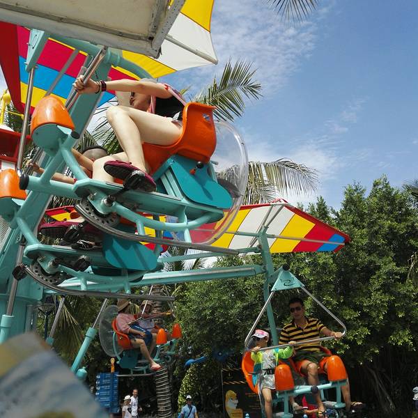 珍珠岛的门票是一价全包的类型,160人民币每人,相当超值。上缆车之前会有人检查包内是否有食物,如果有的话要存包,所以还是不要带吃的去了。后续会提到岛上的吃的其实也不贵,何必去冒风险自带呢。到达珍珠岛的方式其实有览车和快艇两种,包含缆车的门票价格稍高。但是据说这是亚洲最长的跨海缆车,不妨一试。感觉确实坐了好久才到达岛上,俯瞰大海,超乎想象的透彻。这个岛就是一个超大的游乐园啊,室内的室外的、陆地的海上的都有。作为大朋友我也也是不亦乐乎。水上项目超赞,一个超干净的小海滩还有各种刺激的设施。在木讷的外表下,我其实骨子里是个爱冒险的人。真是不易乐乎。一定要带泳装来哦!