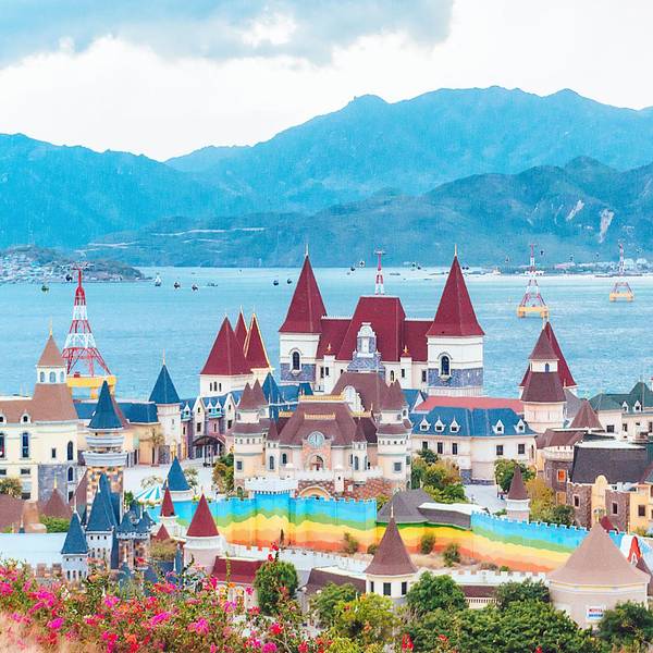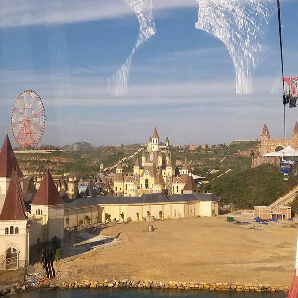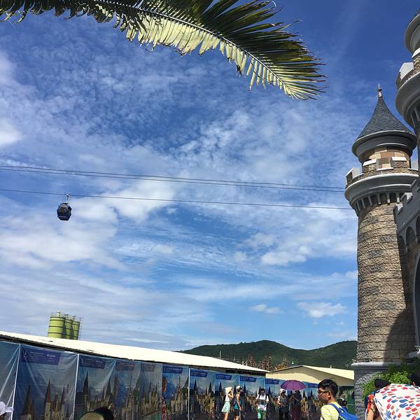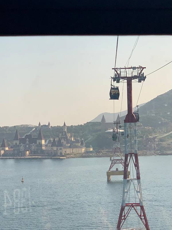 缆车:虽然也可以快艇往返,但相信坐跨海缆车一定是大多数人的选择。白天的风景说不上很好,但视野很开阔。晚上回程的时候,看着浪漫的城堡和摩天轮逐渐远去,是很棒的体验。缆车排队,估计真正的高峰期,需要排队1到2小时。白天景色只能说还好下了缆车就可以取阅导览图,有中文版城堡要晚上看才够味里面有一个小的海洋馆,跟国内的海昌是没法比。随便逛逛还可以体验的第一个项目:矿山小火车。惊险指数2颗星,可以作为入门级惊险项目,哈哈。几乎不排队,来了就上跳楼机,其实我不敢体验。小过山车,惊险指数3颗星。跟我一车是一位70多岁的老大爷,还一直安慰我说不要拍,很是敬佩通往摩天轮的彩虹梯非常高非常漂亮的摩天轮,刚开放不久,上边景色超美珍珠岛上的酒店,预算宽裕的话,推荐住岛上,安静,真正的白沙滩大圆球里是各种花卉园,很精准,下来摩天轮可以依次逛逛。同时里面也是纳凉的好去处。动物园里有各种动物,每天应该还有两场动物表演,已鸟类表演为主很大的视频游戏厅,随便玩。哇哈哈哈。基本小时候的游戏机都有。不过说实话,完全免费,玩起来反而不如当年紧张刺激。最后才来排这个最红的项目:过山车。真正的过山车。惊险指数很低,只有1颗星,但自己控制着滑车飞速而下的感觉真的超爽。排队时间大概30分钟到1个小时。体验时间加起来大概10分钟。我体验了两次。先由电力牵引到达山顶。上山路很长的。下山的时候完全按照规则控制车子,没有拍照。很多人为了拍照减慢车速,导致塞车。使得本来飞驰而下的体验大打折扣,这一点感觉很不好。一段旋转轨道水上乐园,都是高级滑道,吓的我完全没有去体验。而儿童区又太卡通,所以水上乐园这边只是去看了看。时间过得很快,夜晚的城堡很美丽7点有一个喷泉表演,但看惯国内各种豪华音乐喷泉后,这个并不能带来震撼的感觉。表演看了10分钟就赶紧去排队缆车回酒店了,虽然人看着挺多,但排队时间并不很长。夜晚的缆车景色很漂亮!