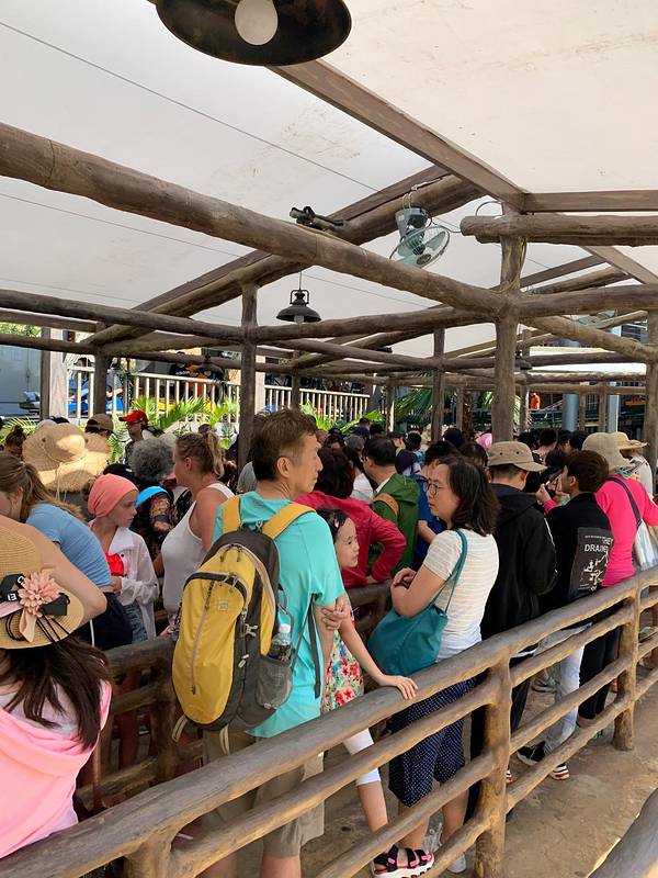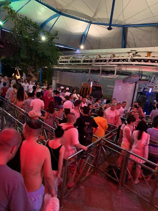 门票出发已上网订好(含午餐的兑换券),去到现场出示电子凭证兑换门票即可,不过游乐场还是热门,各种旅游大巴拉团过来,相当大一部人是国人~~在炎热的天气下排了40分钟,终于上了超长的跨海空中缆车,无比兴奋~~