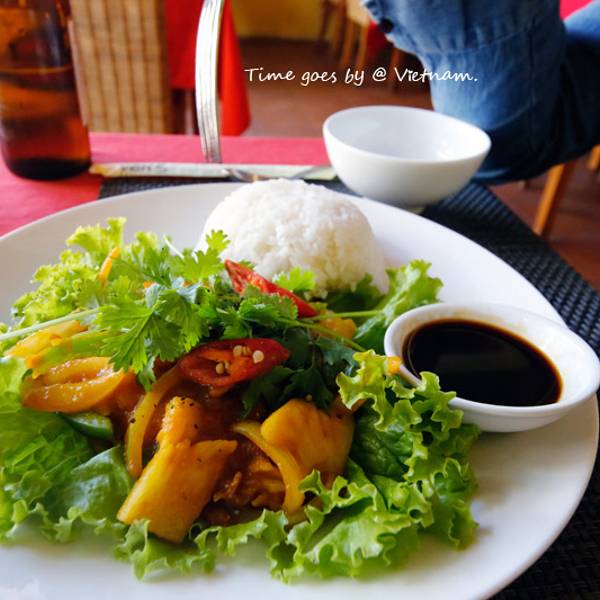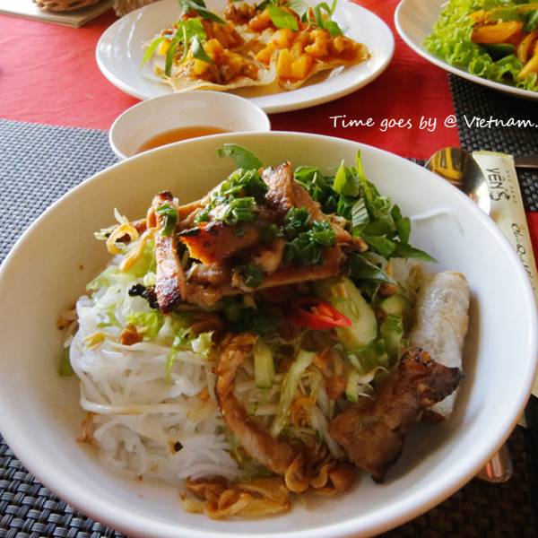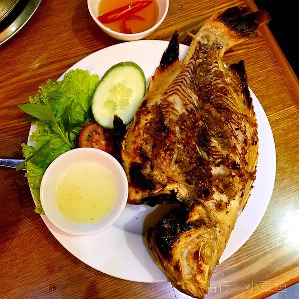 点了海鲜火锅、春卷、碳烤罗非鱼、越南河粉。大概人均90人民币。咖喱牛肉饭也是这家餐厅网友推荐菜之一,只是吃完这些肚子已然喊撑,就未曾尝试。海鲜火锅,虾和鱿鱼Q弹,海鲜锅锅底的味道很奇特,估计是加了这边特有的香料,配着火锅附赠一碟米粉,开始我们还以为需要像面条一样下进去煮呢,经店员指点,原来是直接把干粉盛在碗里,再舀上两勺汤,20秒钟粉化开即可。味道和酒店的米粉不分伯仲,滑溜溜,把海鲜汤的鲜更加扩大了。碳烤罗非鱼,个人感觉这个最好吃,一筷子下去,香气扑鼻。鱼肉嫩白嫩白的,刺也不多。滴上几滴鲜柠檬,和着碳烤的焦香一同入口。越南河粉,Z先生对粉的爱快赶上对我的了。这河粉是扁扁的,不像早餐米粉是圆的,牛肉实打实。鲜虾春卷,不知道是不是里面添加了薄荷叶的原因,吃起来有点怪,略冲鼻子,配着酱吃下。