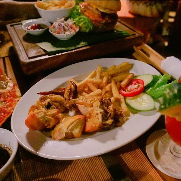 他是一家酒吧餐厅,环境超级无敌好,前面的沙滩也是他们家的,可以在沙滩上吃饭,然后还有像床一样的位子,重点是东西也好吃!但是他家量很大!小胃口的女生点餐要注意哦!