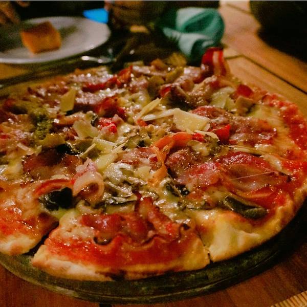 - 培根披萨,非常好吃,薄底料很足,芝士浓郁,趁热吃是非常有层次的口感,推荐金骆驼
