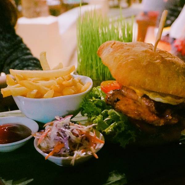 草莓鸡尾酒酒味是可以接受的那种,但会有一丢丢上头,女生点一杯小酌一下挺不错的培根披萨,非常好吃,薄底料很足,芝士浓郁,趁热吃是非常有层次的口感,推荐!炸鸡薯条拼盘,搭配旁边的酱汁,没有炸物的腻味,,也是我们哄抢的一道,不过美中不足鸡肉烤的有一点点过,一丢丢,可以接受牛肉汉堡,夹了荷包蛋,中间那块肉也是汁水四溢又鲜又嫩,不过就是这样下料实在的汉堡就是不太好分,吃起来不是很方便炒饭,最晚上来的一道,估计没啥人点,味道也是很平淡到遗忘的那种,不推荐!