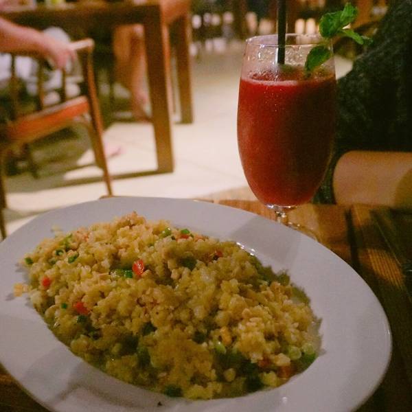 进门处会有大床可以休息,就是一个让人很放松的地方~沙滩旁放了很多懒人沙发和秋千,还会筑起篝火,sailing club的白天与夜晚是完全不同的景象,白天就是一个高级海边餐吧,夜晚的时候就会变成餐吧+酒吧的合体这里有沙发床,很热门的,哈哈,可以躺三个人的样子,吃完饭可以拿着饮料过来,非常惬意舒适说说这里的菜,从味道到摆盘,都非常不错Coconut shake以及两杯鸡尾酒。椰子冰沙味道非常绵密细软,就是量有点儿少