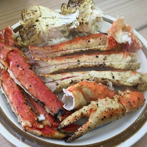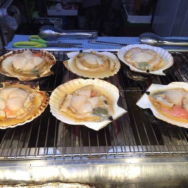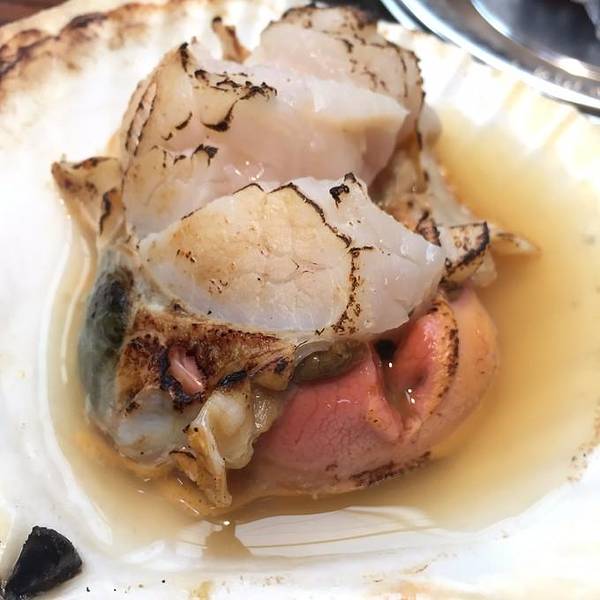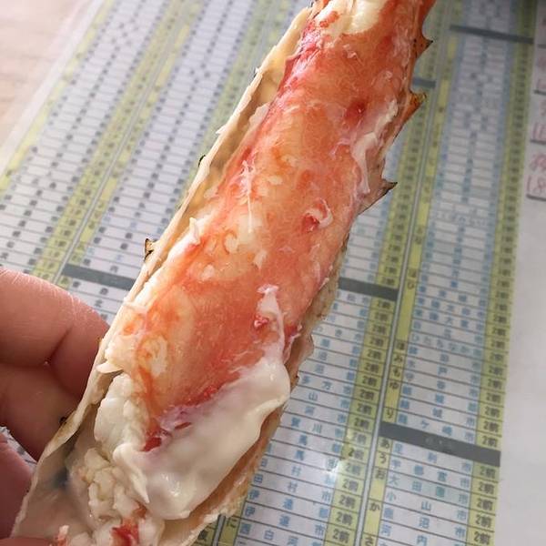特意选择了第四天不要早饭,因为函馆早市呗。 为了这篇游记,我不惜牺牲自己的真实面容,放出一张和帝王蟹的合影。 其实,我的内心是崩溃的。。。 内什么,主要看才华,看才华!!! 再说一句:敢和我比脸大的,都不会有什么好下场,比如这只帝王蟹,半小时后一半水煮,一半BBQ,5人大清早瓜分了。 价格为22000日元,真心值大发了!拉点仇恨,看看那天早上的奢华大餐呗。 到了函馆,不把自己吃吐了,都感觉对不起来回9个小时的火车。新鲜的大扇贝,烤熟了以后,用火枪表面一层烧一下,听得吱吱作响,口水早已经不争气的流出来了。新鲜的海胆,鲜甜得发腻。一丢丢芥末,一点点酱油,还没到嗓子眼,已经入胃,脑子里一片空白,如痴如醉啊!还是鲜甜,甜!!!肉劲道,爽滑,在手上颠来颠去,烫手呀,又舍不得放下。