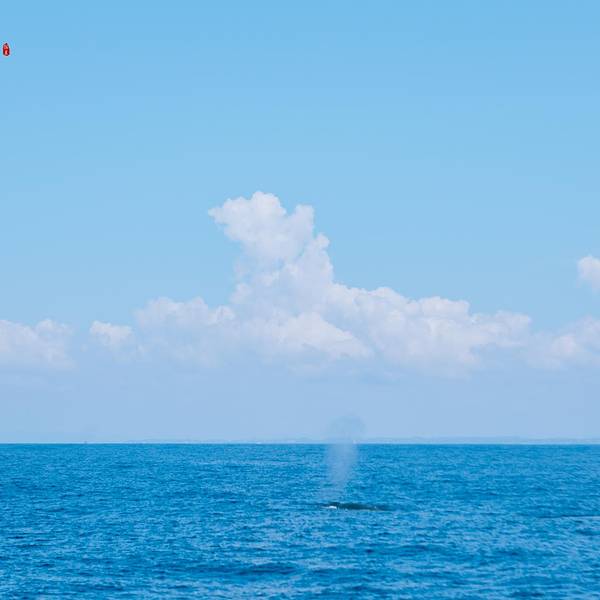 人群突然骚动起来,不远处有一只正在喷水的鲸鱼,我跑到船头瞪大眼睛才看到那一丝丝从水里冒出的水花,终于看到鲸鱼,只不过离得有些远~