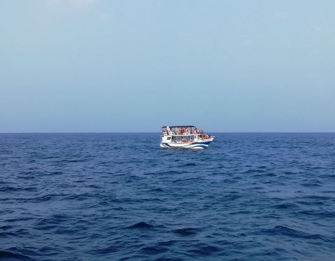 出于对鲸鱼的保护,我们坐的这种大船没法靠得鲸鱼太近,而且鲸鱼出现的时间不长,很可能只喷了一次水就不见了。这时船员会询问是否返回,可以要求再看一次,但要再等上一段时间,而且距离不是很近,我只看到了鲸鱼喷出的高高的水柱。返回途中,会依次分发蛋糕,香蕉和西瓜片。在返回海港时,会有船员微笑着拿着小盒子在游客之间走动,目的是索要小费,并不是强行索取,可以给也可以不给,但大部分游客都会酌情给予,我和同伴一起给了500卢比。