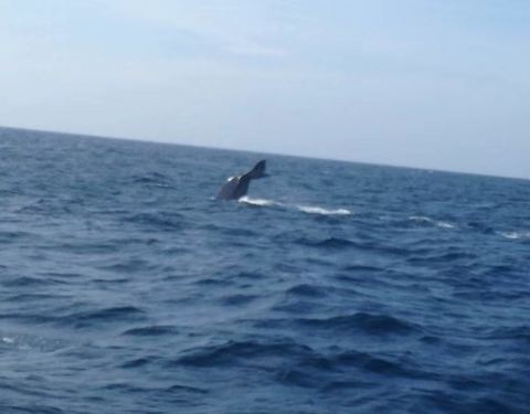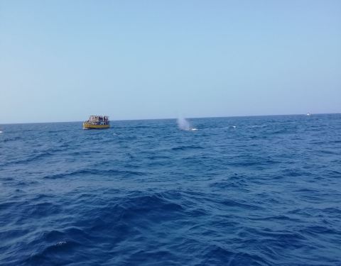 就在距离我们不远处,有一只鲸鱼露出它黝黑的背部缓缓的游着,而后它一个大甩尾钻进水底去,人群是欢呼沸腾的,虽然不是很大的鲸鱼,但是能看到这一幕也算是今日最大的惊喜了。继鲸鱼甩尾之后,又看到双鲸同游,大家心中甚是满足,至少今日还是有所收获的。