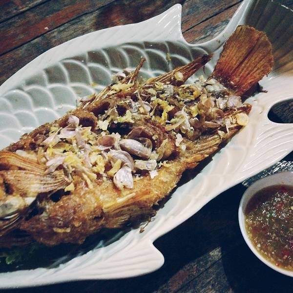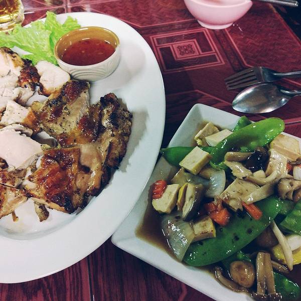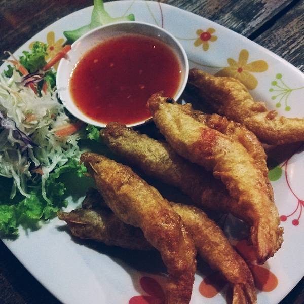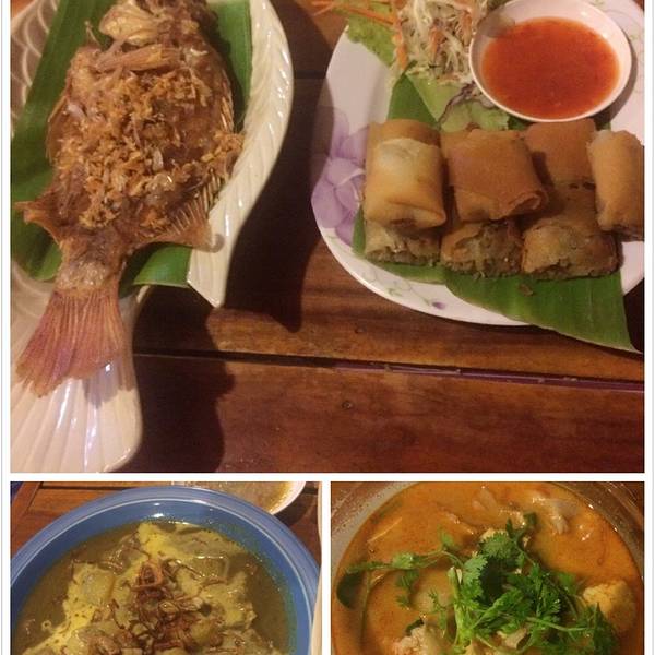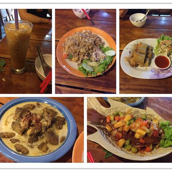 出乎意料的好吃啊!是这几天吃到最美味最便宜的一顿!店里只有3个女孩子在照应,一个当厨师,两个人做服务。需要你自己按照菜单把英文菜名写好交给她们,上菜是按照一个桌一个桌的顺序来的,需要耐心等待。我们点了一条胡椒炸罗非鱼、一盘烤鸡、咖喱虾、泰式炸春卷、一瓶大象啤酒、两杯椰汁冰沙,猜猜多少钱?才RMB100我也是醉了。