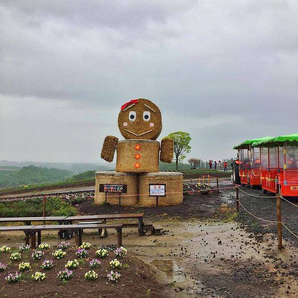 等雨小了时候,我们决定徒步走一走这条超广角之路。大约走了20分钟,我们便抵达美马牛小学。美马牛小学门口小学还在上课,学校是不能入内的。我们也就瞎逛了一圈,拍了个照片走了。小学对面有一个乡村公园。然后接着往前走,走了15分钟,这时我们看到了好几辆旅游巴士停留在这里。我们便抵达四季彩色之丘了。这里有一个小小的市集,卖纪念品,好多薰衣草制品(看了看,大多数made in China,有点失望。)再往里面去就是四季彩之丘了。薰衣草制品海贼王袜子了解一下~是个大大的农场。可以有多种游玩方式,其中一个是坐着观光车观光15分钟。然后我们用尽洪荒之力和售票老板娘沟通下来,目前有大概贴着地皮开的一点点三色堇(参考中国路边绿化),而且下着大雨,推荐观赏天晴了观赏。门口的稻草堆叠的两个娃娃很是吸睛。稻草女娃娃稻草男娃娃我们决定冒雨去拓真馆,大约需要走30分钟路程,上坡下坡,路边偶有几个房屋,一望无际的农坡很是壮观。前往拓真馆路上的花超广角之路超广角之路超广角之路超广角之路路上就我们,这时候库存里周杰偷的《蒲公英的约定》也很是应景。超广角之路的一排树林抵达拓真馆前,需要从公路上走下去穿过一片白桦林道,然后黄黄的一栋小建筑就展现在我们面前。拓真馆门前的白桦林这就是拓真馆啦,免费参观,里面不能拍照。拓真馆里展放了著名摄影师前田真三拍摄的美瑛风光的作品。很值得一看!拓真馆拓真馆门前的小花园拓真馆16:45最晚进场,17点关门哦。超广角之路超广角之路超广角之路参观完后,我们一路往回走。来回到四季彩之丘是一条路,但是有不同的风景。抵达四季彩之丘时,这里已经关门了。红绿大胆色系的仓库也很酷呢!从这里我们决定换一条路走回车站,路上遇到一个人家的滑滑梯等小玩具很是可爱。少女与仓库剪刀手与路四季彩之丘的幼儿园四季彩之丘的幼儿园四季彩之丘的幼儿园这一路,雨忽大忽小。路上人不是很多,只是偶遇几个还热情的指路。这一路,人家不是很多,但是屋前屋后便能看出大家都在享受自己的生活方式。超广角之路旁的民房超广角之路旁的民房前的绿化超广角之路旁的民房前的绿化美马牛车轨少女与铁轨