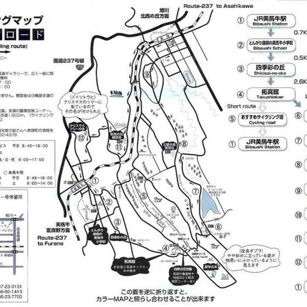 ...美 瑛的观光案内所可免费获取,一定要随身带一份,提前做点功课也好,不至于上路后还花费精力找路线早早地跟着房东的两个小女儿,搭上免费校车,乘坐JR到美马牛,超广角之路就在这里展开。下车后无需到对面的车站去,路边有一块蓝色指示牌,上面标明了租车地点以及超广角之路的景点路线。熟悉你要去的景点名称、...早早地跟着房东的两个小女儿,搭上免费校车,乘坐JR到美马牛,超广角之路就在这里展开。下车后无需到对面的车站去,路边有一块蓝色指示牌,上面标明了租车地点以及超广角之路的景点路线。熟悉你要去的景点名称、顺序,然后用谷歌地图导航,这是最为便捷的方法,每一个景点都可以在地图上搜索到。可以完全放心跟着地图走,一路的岔路也不会太多,且分岔路大多都有路标指示,比想象中好走。弄清楚方向路线后,就大胆地骑出去吧,一路享受美景就好~【超广角之路】山の小屋租车行—四季彩之丘—拓真馆—千代田之丘——三爱之丘展望公园——四季之塔——美瑛站——新荣之丘展望公园——圣诞之树——美马牛站——租车行我俩跟着路口的指示选择下一个景点,直接从千代田之丘骑回了四季彩之丘,花了四个小时。比骑完全程少了十公里左右吧,不知道我们是否太贪玩,因为我关注到大多数网友也是用四小时骑完全程的。
