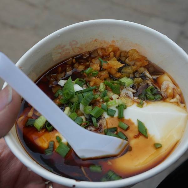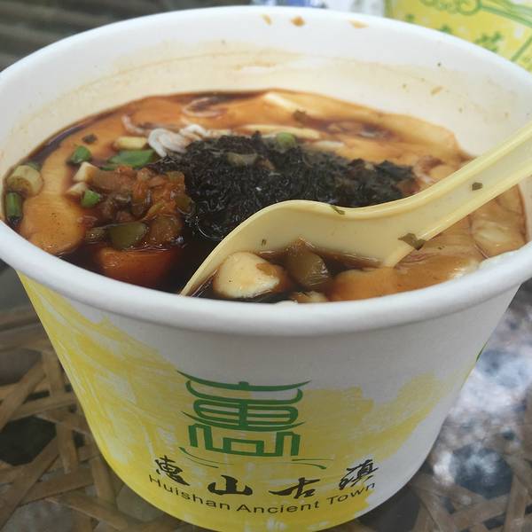 惠山古镇倒是蛮古朴的,感觉没有很浓的商业氛围,游客也不算多。兜兜转转,在一条小路转弯瞬间,顿时闻到一股香味,顺着香味一抬头,“老曹小吃铺”跃然入眼。再一低头,就看到那盅始终炖着的酱,香味就是从这盅酱汁传出来的。老曹的豆花没有豆腥,由于放了秘制酱汁,带有一丝甜味,但有点略咸,总体还是相当不错的,尤其在大冷天吃上一碗热热的豆花,整个人都变得暖暖的。顺便说一句:本人从小不爱吃豆花,这个豆花我是吃下去的。