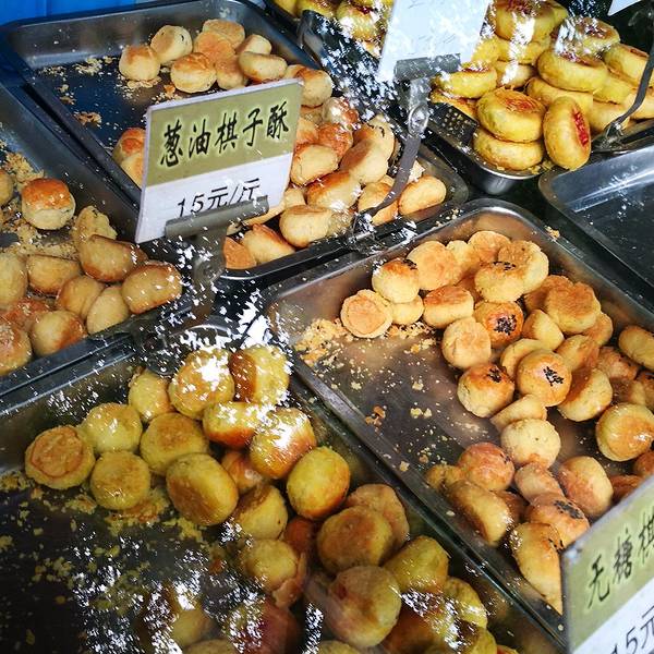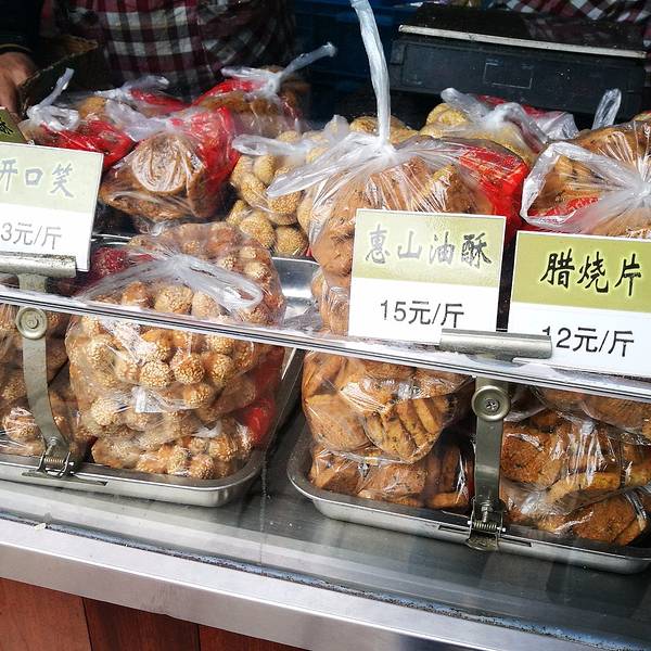 单单游玩古镇是不需要门票的,如果要进什么园子的话,可以买联票。刚进古镇,就看到“朱顺兴油酥”,看其他几篇游记都说这个挺好吃的。我们也顺应买了一袋(15元),油酥外表看像麻球,里面有馅,一口咬下去,一脸苦相,是我最不爱的百果馅,想我吃广式月饼最不爱的就是百果和五仁,结果买了个油酥却是我最不爱的。吃了一口,就没有继续吃下去,默默的放进包里。那天正好降温,冷风吹的我们三姐妹瑟瑟发抖,想吃个热乎点的东西。知道惠山豆花很有名,惠山的老曹豆花更有名,所以在闲逛古镇的同时,找起惠山老曹豆花。