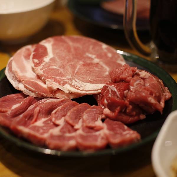 除了羊肉,还有蔬菜会被放在烤盘最外圈,这家店的蔬菜是可以免费加的,第一波是服务生帮忙烤的。羊肉一点膻味也没有,肉很嫩肉汁超丰富。