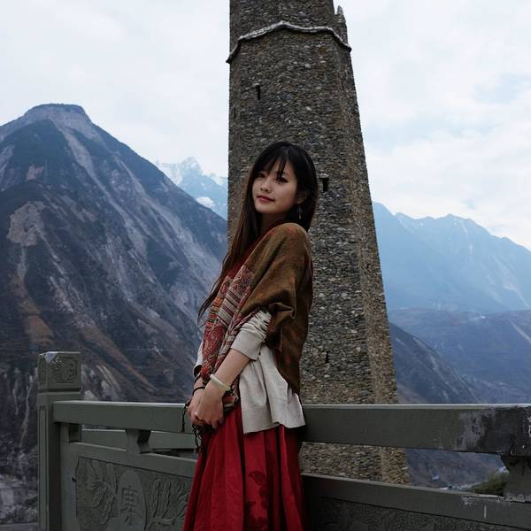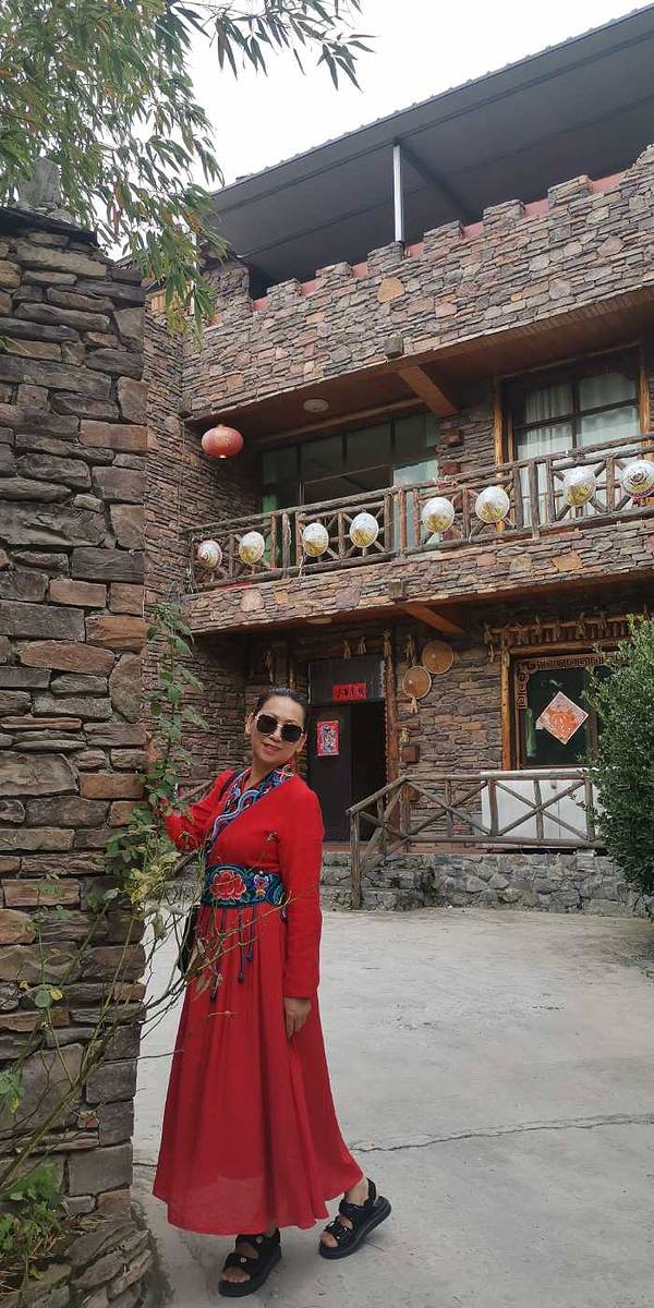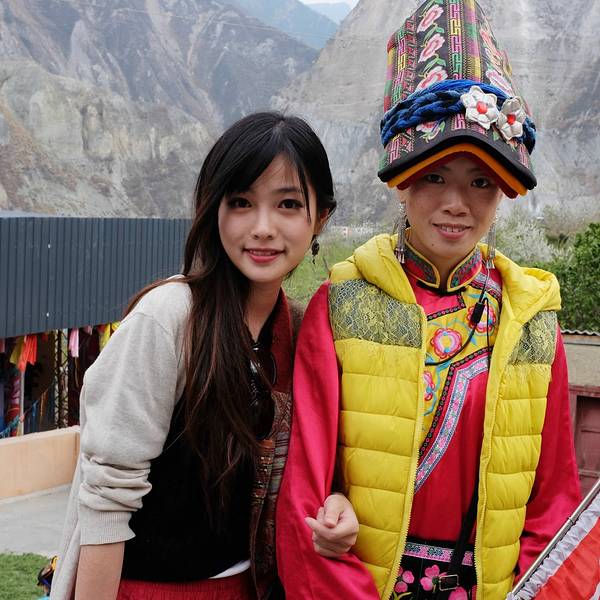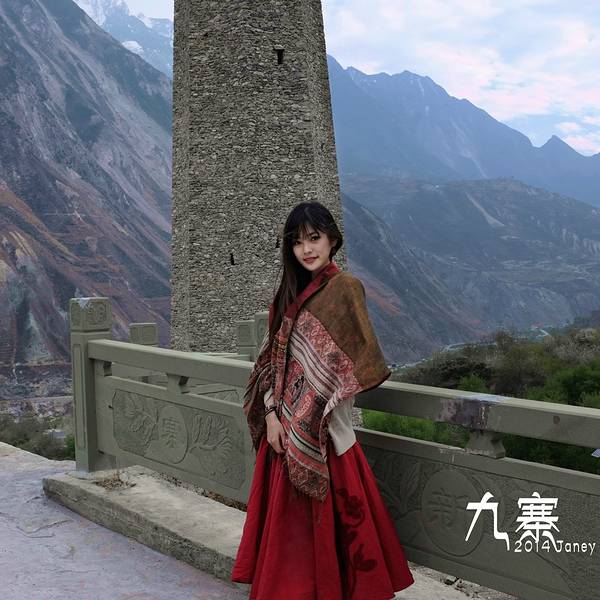 好开阔的视野和风景,还有独霸天下的我……哈哈。我和瑟嫫(姑娘)的合影,她身上是精美的羌绣下午达到了羌寨,他们以前为了防止敌军搬到了山顶居住,号称云朵上的民族,进寨会经过吊桥和碉楼,羌族有四绝:萨朗(歌舞)、羌笛、羌绣、羌银。