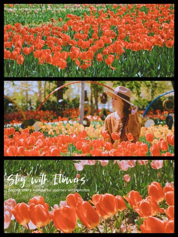 花海行间设置了可...现在正是郁金香绽放的季节,