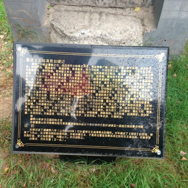 羑里城又称文王庙,属国家重点文物保护单位,其处有7米厚的龙山文化和商周文化遗存,是3000年前殷纣王关押周文王姬昌7年之处,是有史可据、有址可考的中国历史上第一座监狱。此处也是文王据伏羲八卦推演出64卦384爻,即“文王拘而演周易 ”之圣地。姬昌在羑里被囚的漫长岁月里著成《周易》一书,后被列为五经之首。这便是历史上著名的“文王拘而演周易”的故事。后人为纪念西伯姬昌,在羑里城遗址上建起文王庙。 展开