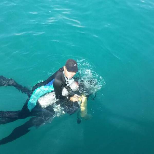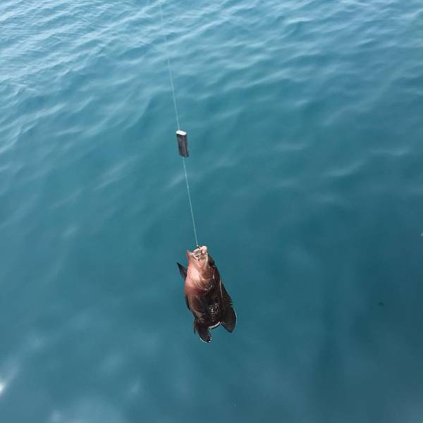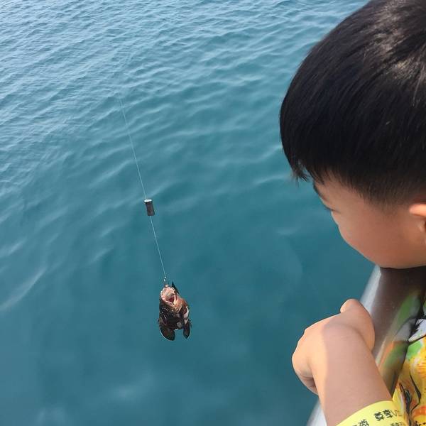 游到艇边上,豆豆和老婆在钓鱼,正好看到她们钓上那条黑鱼。豆豆大喊:爸爸,你快看,我钓上来的鱼〜! 说真的,我都蒙了,这么小的孩子第一次海钓就能钓上鱼来,这运气真的不是一般二般的好。这是好到暴棚了。希望这样的好运气永远陪伴在豆豆左右!