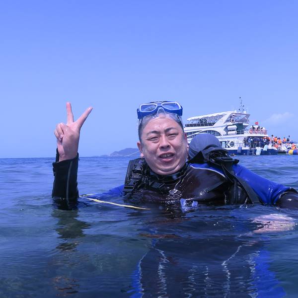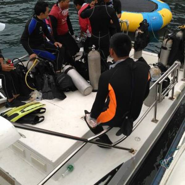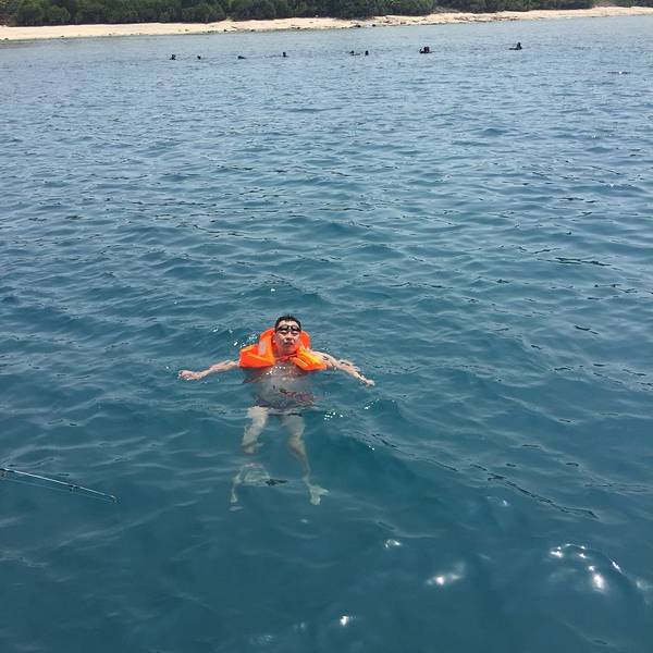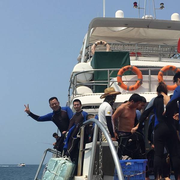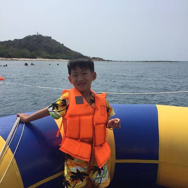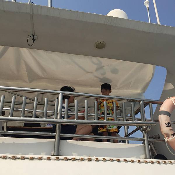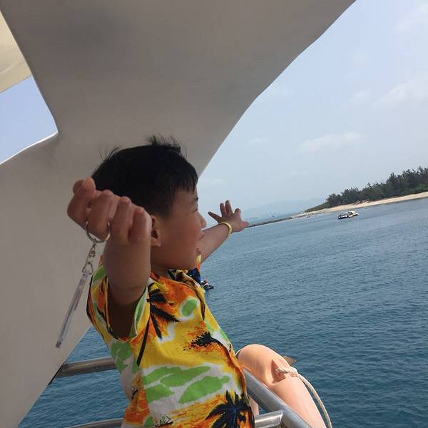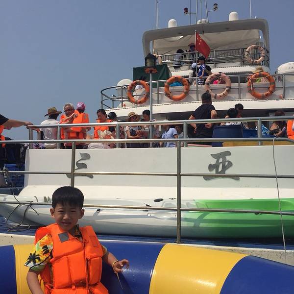 首先,这是一条大艇,上这条艇的人有的是花钱买票上来的,有的是订酒店送的,有的是网上秒杀的,有的是团购的,总之各种优惠价上来的。 而上艇的说明里写的很清楚,不管你花了多少钱上艇,都是在一层大厅, 二层和三层想上去怎么办呢? 答案是VIP,150元一位。 免费红酒,自助餐(饭不怎么样,在海上也别想吃的多好,除非是包艇的那种) 既然都已经上游艇了,也不差那300块钱了,对吧〜〜〜 有些人没上二层和三层,主要以老人为主。 上二层和三层的有情侣,有像我们这样的一家三口。 其它消费项目,潜水免费,但是一次性咬嘴60元,潜水服免费。 也就是说只要花60就可以去潜水了。 拍照300元。 录相500元。 摩托艇我没记住多少钱。 海里游泳免费,香蕉船免费,还有一些免费的项目,都是适合小孩子玩的。 还有就是海钓,免费提供渔杆,渔食,渔杆押金100,玩完后退钱。 这个还是不错的。别的不说了,果断交360元,其中VIP 300元, 60元潜水咬嘴和海底喂鱼的鱼食。 VIP就是不一样,免费的饮料(芒果汁和椰奶) 水果(西瓜,圣女果)零食(果冻,小饼干) 一楼的没有。。。。。VIP的人不是很多,大概一半人吧〜〜〜〜〜来张游艇顶层的自拍照出港后50分钟,游艇来到了我们的目的地——东岛。顶层的风挺大〜〜〜〜 不过,豆豆你在干什么呢?咱不带这样的。老婆和豆豆好开心〜来张另一个大艇的背景照。我们一家三口〜!船尾的自拍照豆豆,你的手放哪呢?途经凤凰岛这回豆豆回幼儿园的时候可以跟小朋友说了,你们有没有在游艇上玩过泡泡?好开心啊〜〜〜!游戏开始了,老婆带豆豆先进橡皮船里玩去了。来个我们坐的大艇的背景照豆豆自己钓上来的鱼,当时我还在海里潜水,老婆给拍的照片。 当鱼出水的那一刹那,豆豆的欢呼声整条船的人都听到了。 我想这应该是最小的海钓者了吧〜 哇哈哈!老婆在帮着豆豆把鱼拉上来。快乐的一家我会游泳,但船老大还是让我穿上这个。又钓上一条。。。。。。我们俩〜〜〜〜〜〜〜抱着儿子在游艇上看大海,好幸福啊〜!!!你们两个是我生命中最重要的我要下海了又见剪刀手这张拍的好自然大海,我来啦!!!!因为潜水的感觉太好了,海底的景色太美了,当上浮的时候教练问我想不想拍几张照片。 说句实在话,我真的无法拒绝!!!! 这样的消费,我愿意〜! 300块一个字:值! (之前我了解过别的潜水380元一位还不送照片,拍照另外收费)在海底珊瑚边拍照第一次潜水感觉很棒YEAH!〜看见我左手拿的东西了么,那是在海底喂小鱼的。潜水之后在往大艇游的路上把手里的鱼食撒完,教练带我浮出水面,这时离大艇没多远了,因为我会游泳教练说自己游回去行么? 我说没问题,然后他就把保护装备全帮我拿下,让我自己游了回去,第一次在深海里自由游,艇上的所有人都在看我一个人的表演。 在快到艇的时候我停下来,躺在了海面上,这是我爸教给我的绝技:水上漂〜〜〜 也就是不借助任何物体,只靠身体躺在海面上,双脚露出水面。 这时我听到艇上的人的赞叹,这哥们水性真好〜!(HOHO,装B成功〜!)