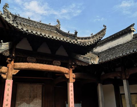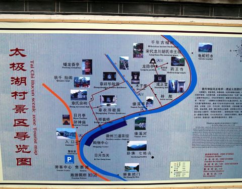 太极湖村,又名湖村,位于绩溪县东北约17公里处,南宋龙川枢密使胡云龙葬于此地,胡氏后代守墓成村,后来章氏超越胡氏,成为村中大姓。缘溪河穿村而过,呈反“S”形,河西是村庄,河东是农田,整个村落看上就像一副太极图,4月可赏农田上的油菜花开。比起其他徽派古村,太极湖村不大,但以众多砖雕门楼取胜。 太极湖村虽属宣城市,但离宣城远,约140公里,离黄山市区近,约70公里,所以还是从黄山市区出发比较方便。村子的主入口在南边,还未进入口,就能依次看见狮象把门、日月当关两道水口,其中狮象把门处左右两山夹着中间的流水,风景很好。入村后参观的第一个重要景点是章氏宗祠,始建于明代,门前的照壁上绘着模样像麒麟的“犭贪”。祠堂里的木雕精美,还可以看到当地盛会游行时和秋千抬阁相关的道具,比如幼童凌空悬于方形抬阁上的示意模型、被当作礼炮用的三门铳、明代观音台和蟠龙香亭。其中蟠龙香亭非常有看头,亭上六条蟠龙栩栩如生,而且能拆卸下来。出祠堂,便来到明代水街吟泉街,溪水沿街流淌,白墙黑瓦的明清古建筑沿街而建。继续往前可以看到一条小巷,巷子里集中了7座砖雕门楼,薄薄一层砖面上的镂空雕刻立体感极强,细处仿佛一掐就断,特别漂亮。往村尾走,龙隐亭下有口水井,亭旁的房子已有800多年历史,是当时胡氏守墓人居住的地方,亭后则是宋代龙川胡氏帝王坟。帝王坟上生长着一棵千年苦楮树,七八个人也难以合抱,站在树下远眺南边的七姑山,形似睡佛。药王寺距墓冢不远,与其说是寺庙,倒更有徽派民居的特点。太极湖村内没有什么吃饭、住宿的地方,因为很快能转完,也没有食宿的必要。一般游客会把从南至北的龙川风景区(距绩溪县11公里)、胡宗宪尚书府(距龙川200米)、太极湖村(距龙川6公里)放在一起游览,龙川吃饭、住宿都很便利,可以先玩太极湖村,把落脚点放在龙川,或者索性回绩溪县住宿。